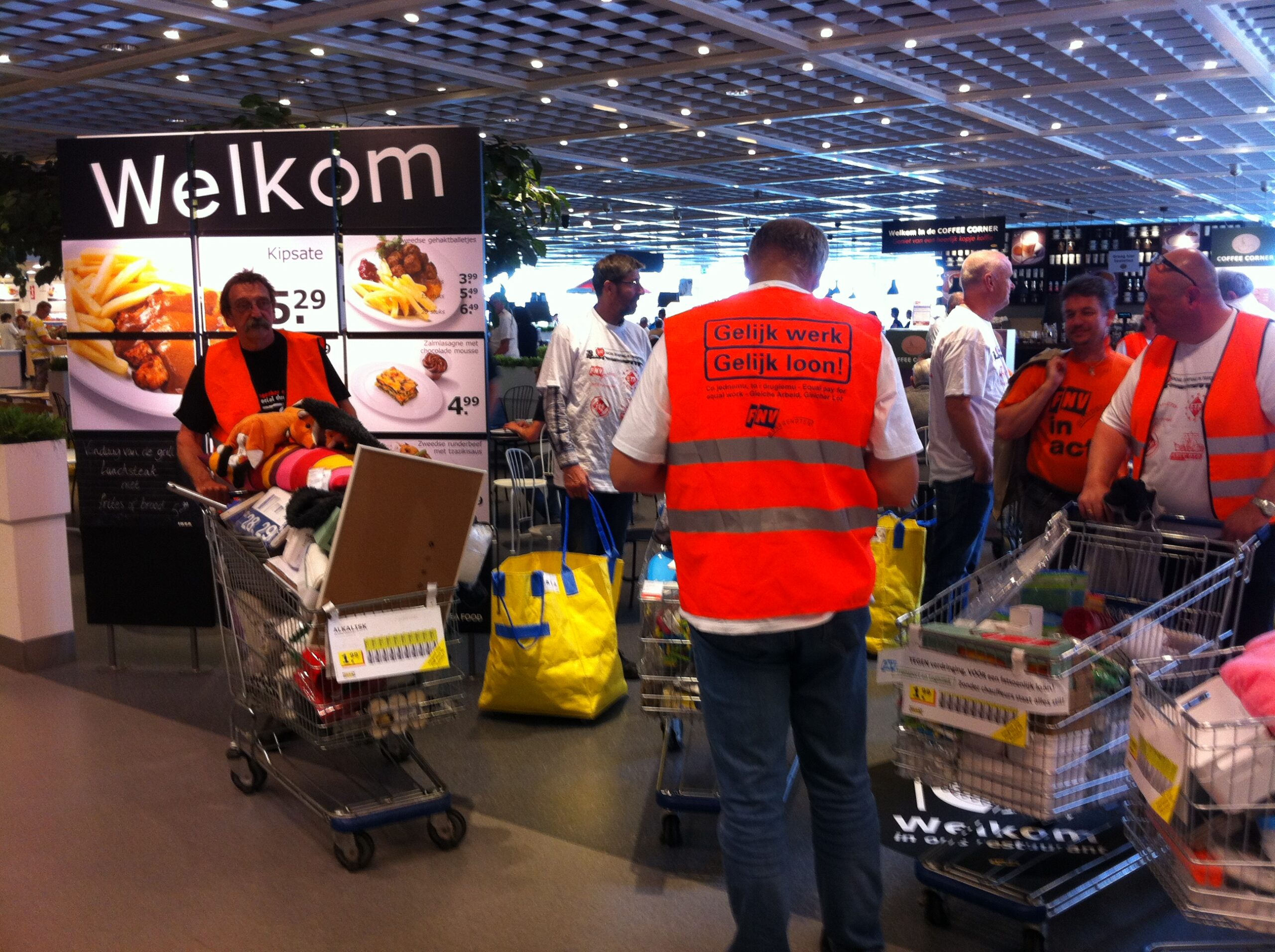 Nog een foto van de ‘plunderactie’ gisterochtend bij IKEA Barendrecht. Met deze actie wil FNV Bondgenoten het winkelconcern wijzen op zijn ketenverantwoordelijkheid.