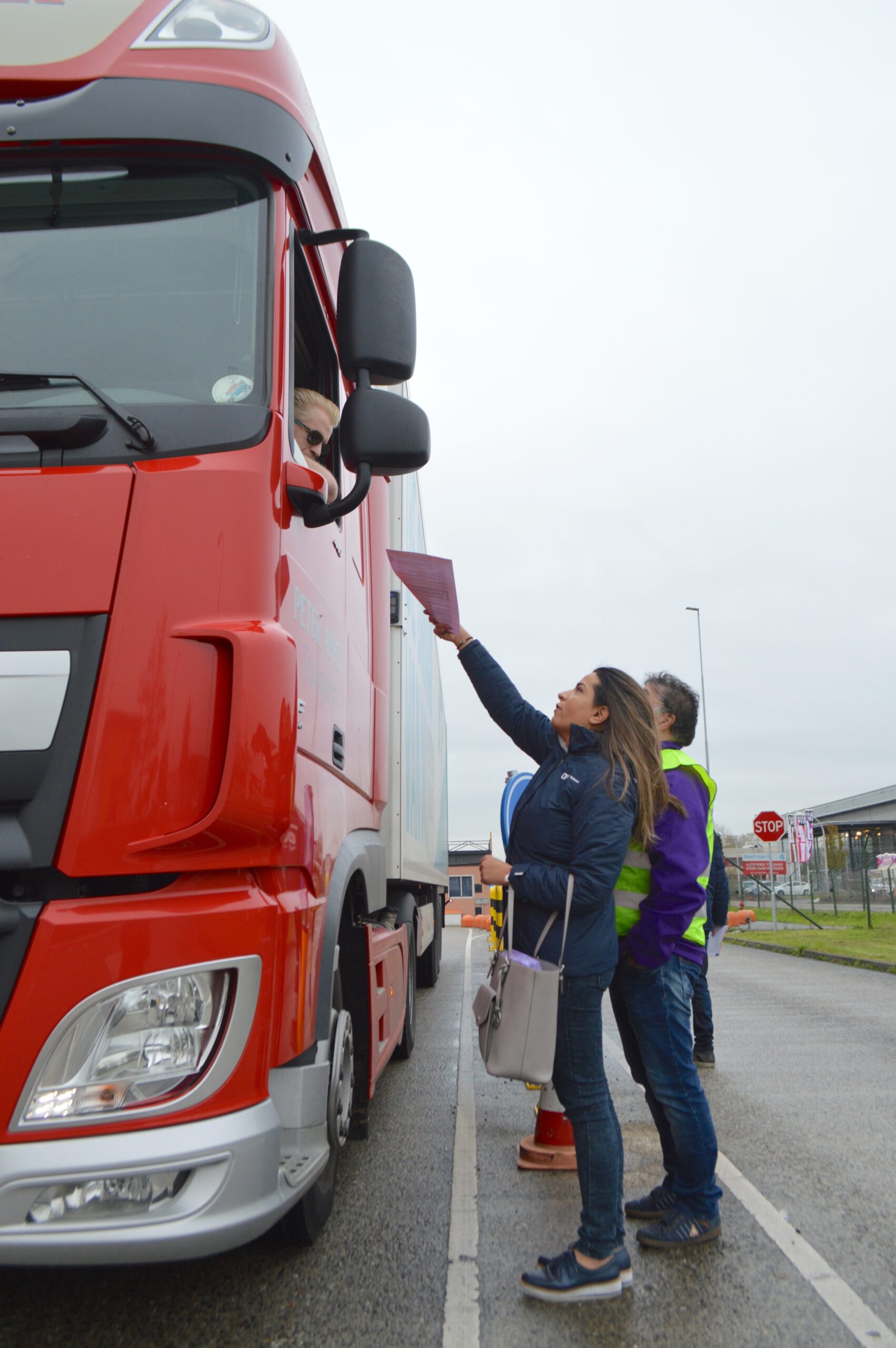 Op de foto: Medewerkers van vakbond CNV delen flyers uit om chauffeurs erop te wijzen dat zij mogelijk nog duizenden euro’s tegoed hebben.