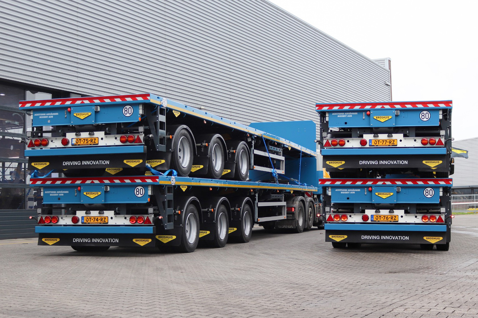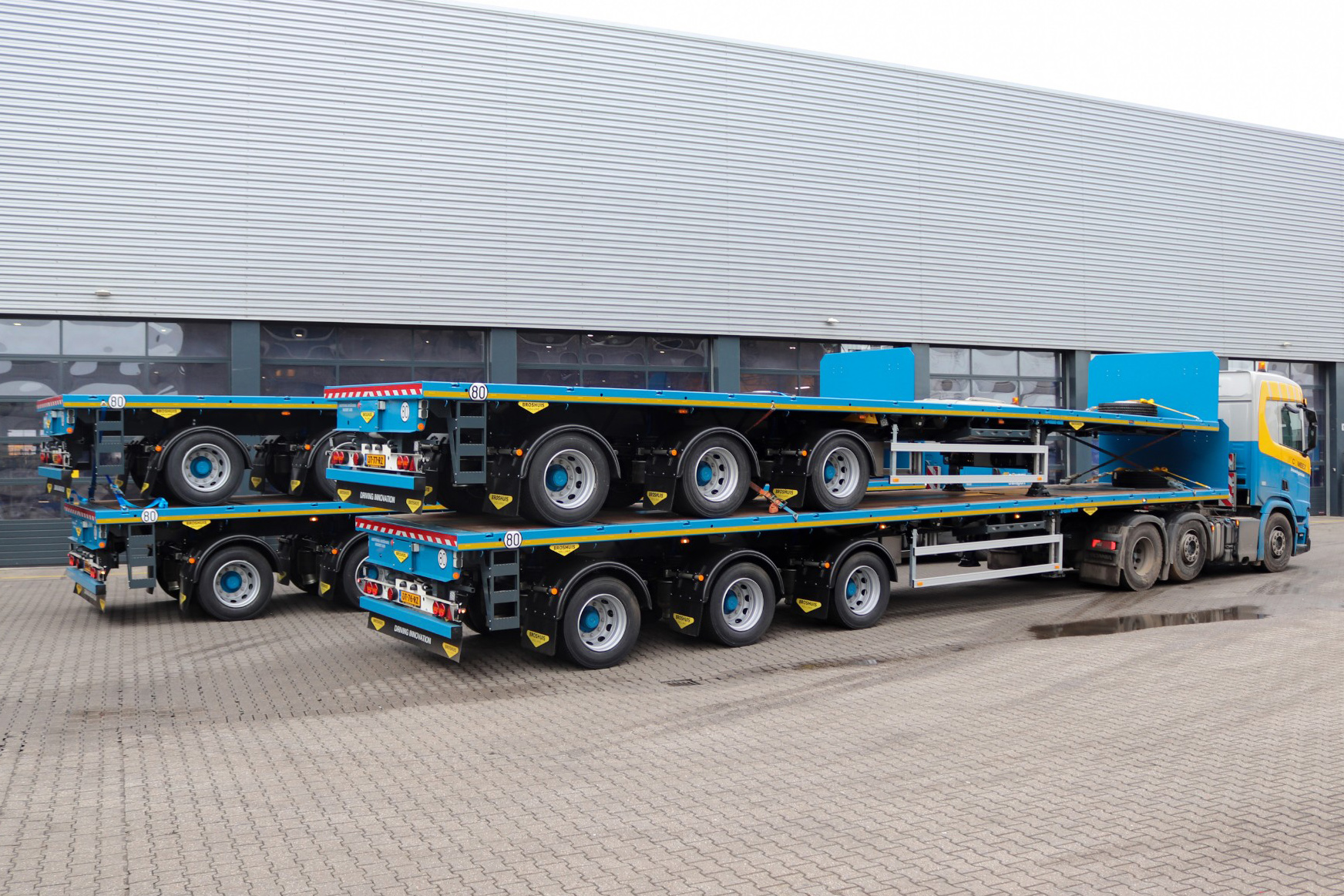 Het gaat om een uitbreiding met 10 stuks 3-assige vlakke opleggers enkel uitschuifbaar. Deze zijn geheel volgens de wens van de klant gebouwd. Zo zijn de nieuwe opleggers uitgerust met vastzetmogelijkheden voor laadbokken waarmee heipalen over het dak van de cabine vervoerd kunnen worden. Deze laadbokken zijn zo gepositioneerd dat de gewichtsverdeling van de combinatie optimaal benut kan worden.