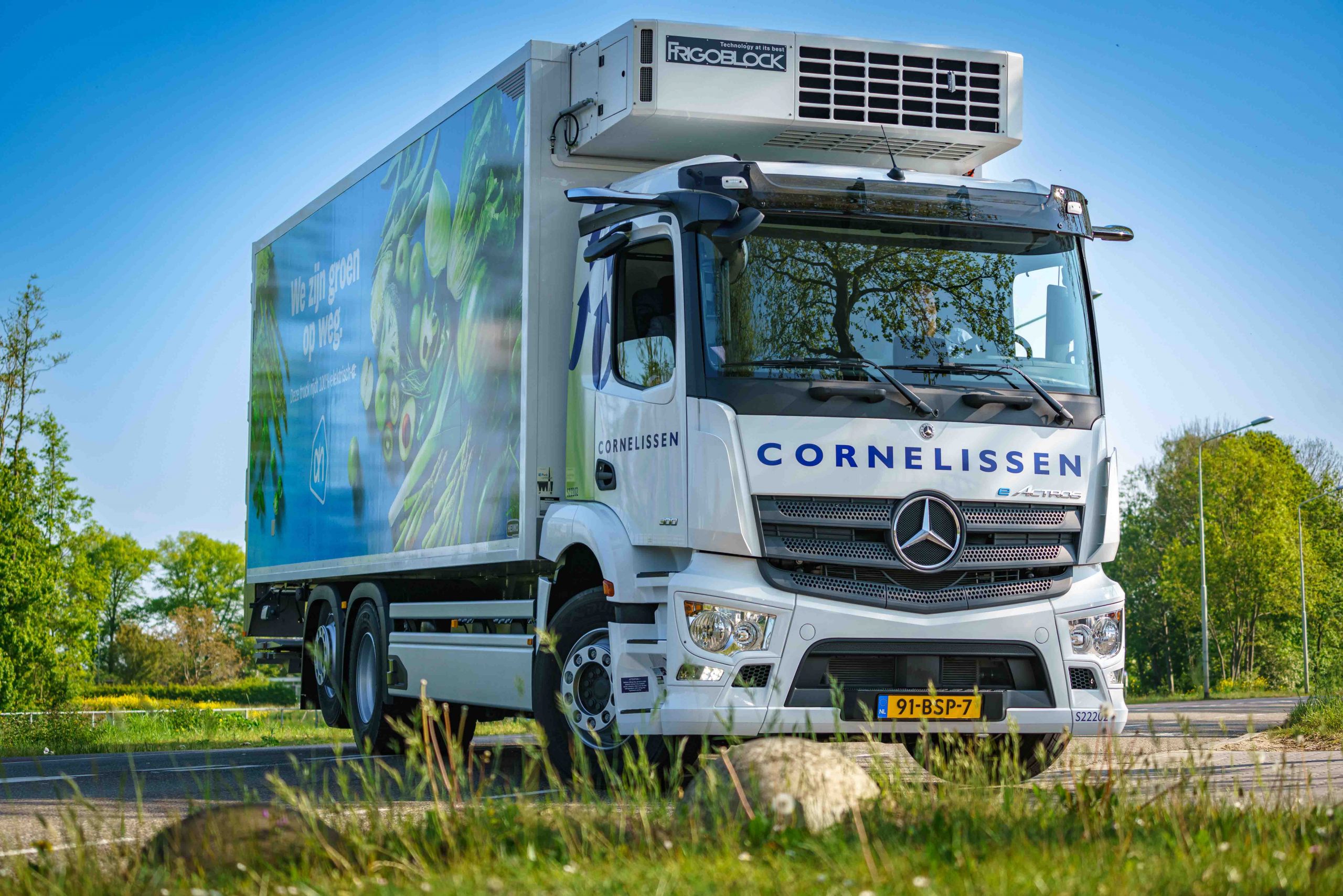 De eActrossen hebben hun eerste kilometers voor Cornelissen Groep inmiddels gemaakt. Directeur Van der Drift hierover: “De chauffeurs die op de eActros rijden, hebben onder leiding van instructeurs van Mercedes-Benz kennis gemaakt met de truck. Waar ik vooral enthousiaste reacties over hoor, is het rijcomfort, de actieradius en de praktische bruikbaarheid.” Richard Bos, Key Accountmanager bij Mercedes-Benz Trucks Nederland verklaart: “Het comfortniveau ligt hoog, mede omdat de eActros volledig luchtgeveerd is. Daarbij is de volledige ruimte tussen de cabine en achteras ingericht voor gebruik als elektrische truck. Resultaat: een capaciteit van 336 kWh vermogen en een actieradius van zo’n 300 kilometer. En dan sluit de truck qua maatvoeringen natuurlijk ook nog naadloos aan op het werk voor Albert Heijn.”