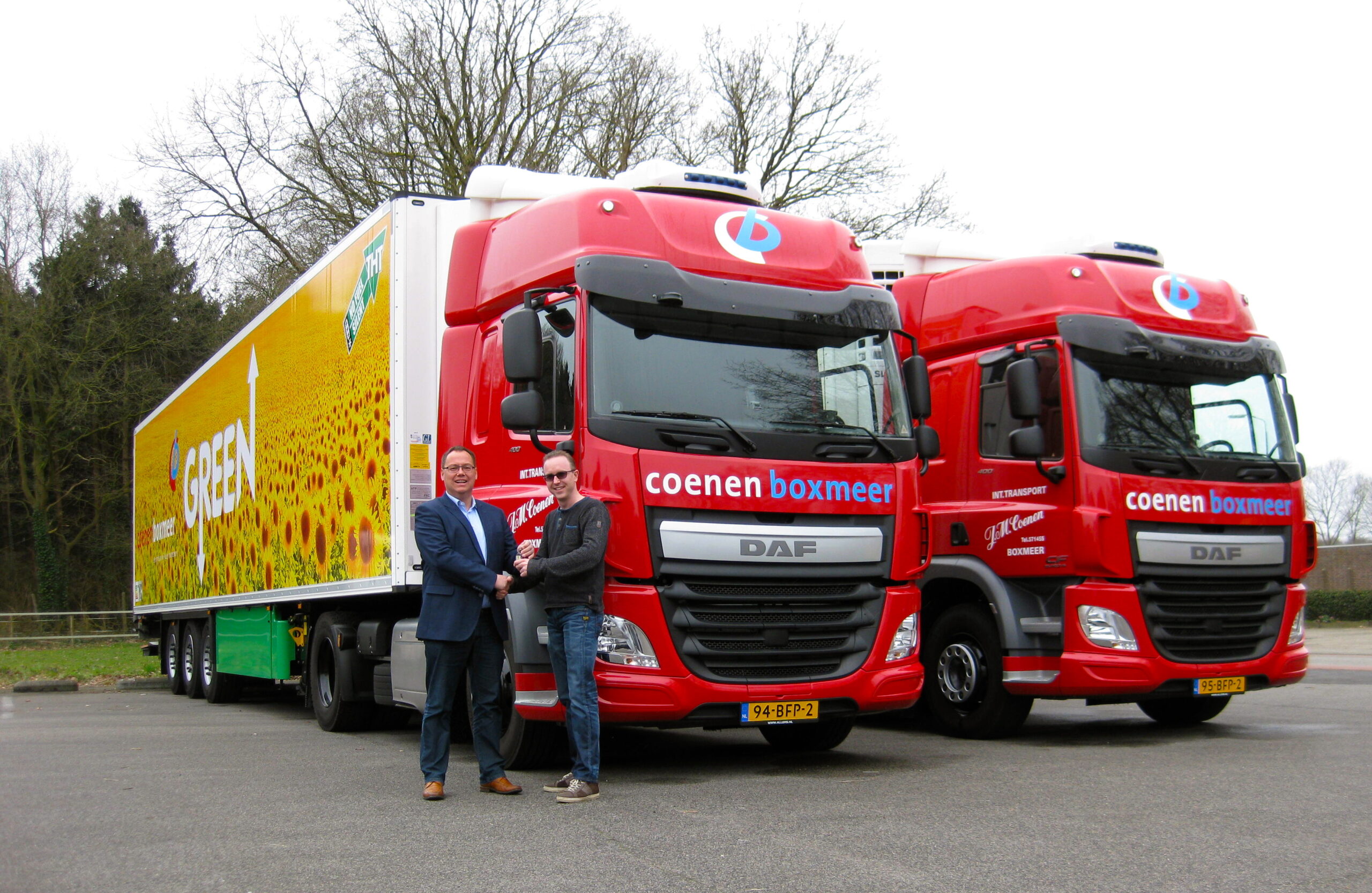Foto: Twee van de drie nieuwe Silent DAF CF 400 FT trekkers van Coenen Boxmeer, met de groene Heetkamp- oplegger. Theo Coenen (rechts op de foto) ontvangt de sleutels van Frank Huisman.