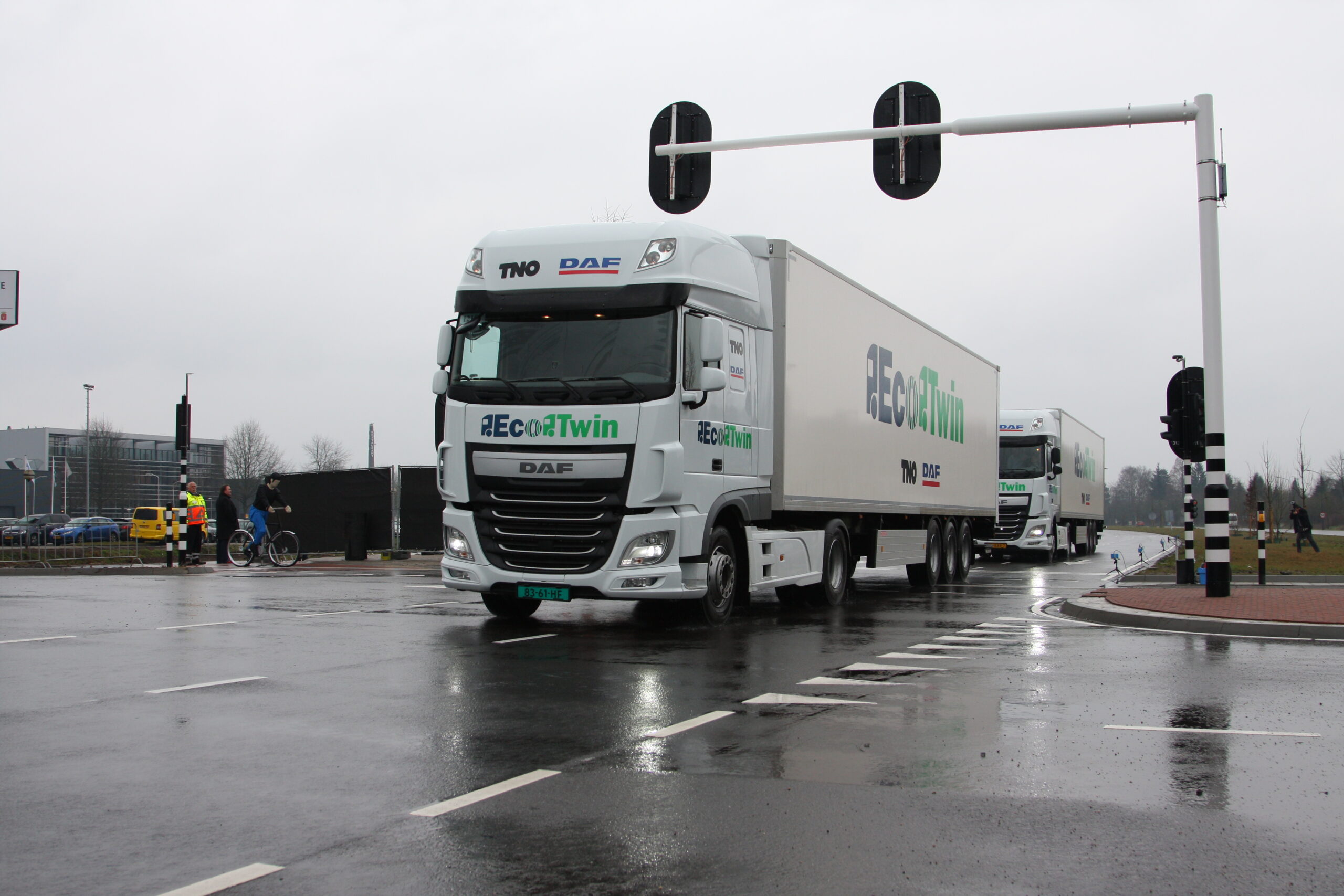 Plots stopt de voorste truck voor een groen verkeerslicht. De volgtruck staat gelijktijdig stil. De EcoTwin platooning-demonstratie werd uitgevoerd op een afgezet stuk van de N270, voor de deur van de Automotive Campus in Helmond.