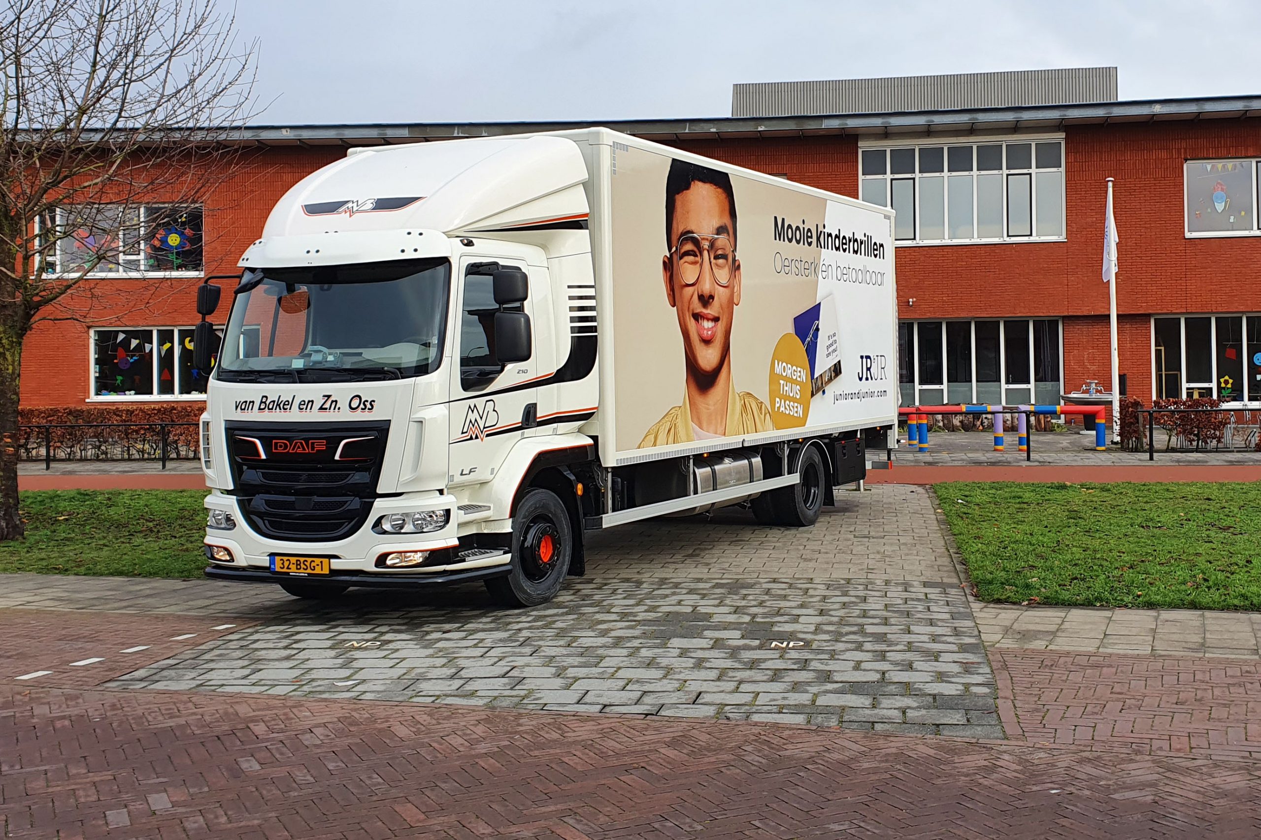 De bakwagens zijn uitgevoerd in de bedrijfskleuren van het transportbedrijf en de cabine is voorzien van een dakspoiler en fenders. Opvallend zijn de prints op deze eerste afgeleverde bakwagen met reclame voor kinderbrillen. Van Bakel: “Het gaat om betaalde promotie. De bakwagen zou inderdaad wat ruim bemeten zijn als we alleen kinderbrillen vervoeren. Ook al zal er best wel eens een zending brillen deel uitmaken van de lading. Maar met deze fraaie print vallen we lekker op. De vier LF’s krijgen stuk voor stuk een verschillende full-color reclame-uiting.”