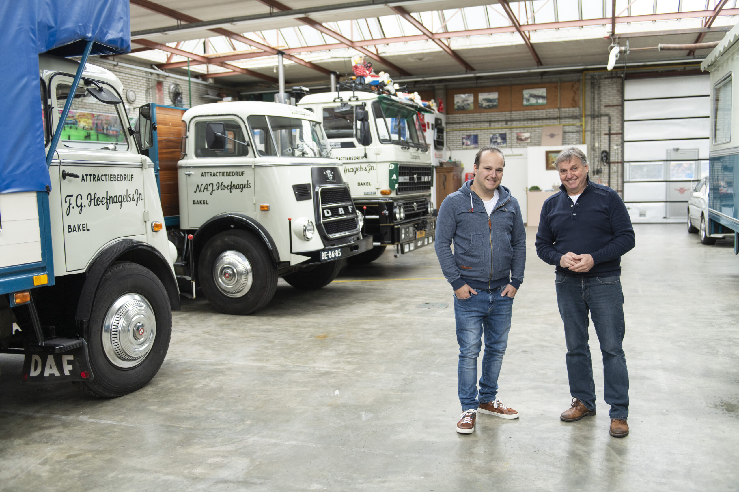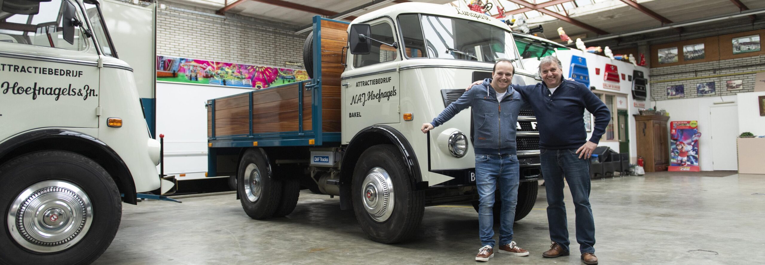 DAF kondigde de zoektocht naar de oudste truck eerder dit jaar aan ter gelegenheid van het 90-jarige bestaan. Met een filmpje op social media van een veehandelaar die met zijn DAF uit het begin van de jaren 80 door Ierland rijdt, werd die zoektocht gestart. De video werd bijna een half miljoen keer bekeken. Reacties kwamen uit de hele wereld. Toch werd de oudste truck bijna ‘in de achtertuin’ van de DAF-fabriek in Eindhoven gevonden. In Bakel, om precies te zijn. De oudste is het trotse bezit van familie- en attractiebedrijf Hoefnagels uit Nederland, dat ermee zijn kermisattracties door heel Nederland rijdt. Op de foto die vader en zoon Frits en Nicky Hoefnagels via Facebook naar DAF stuurden, fonkelden liefst vier klassieke DAFs; stuk voor stuk in topconditie – want altijd vertroeteld.
