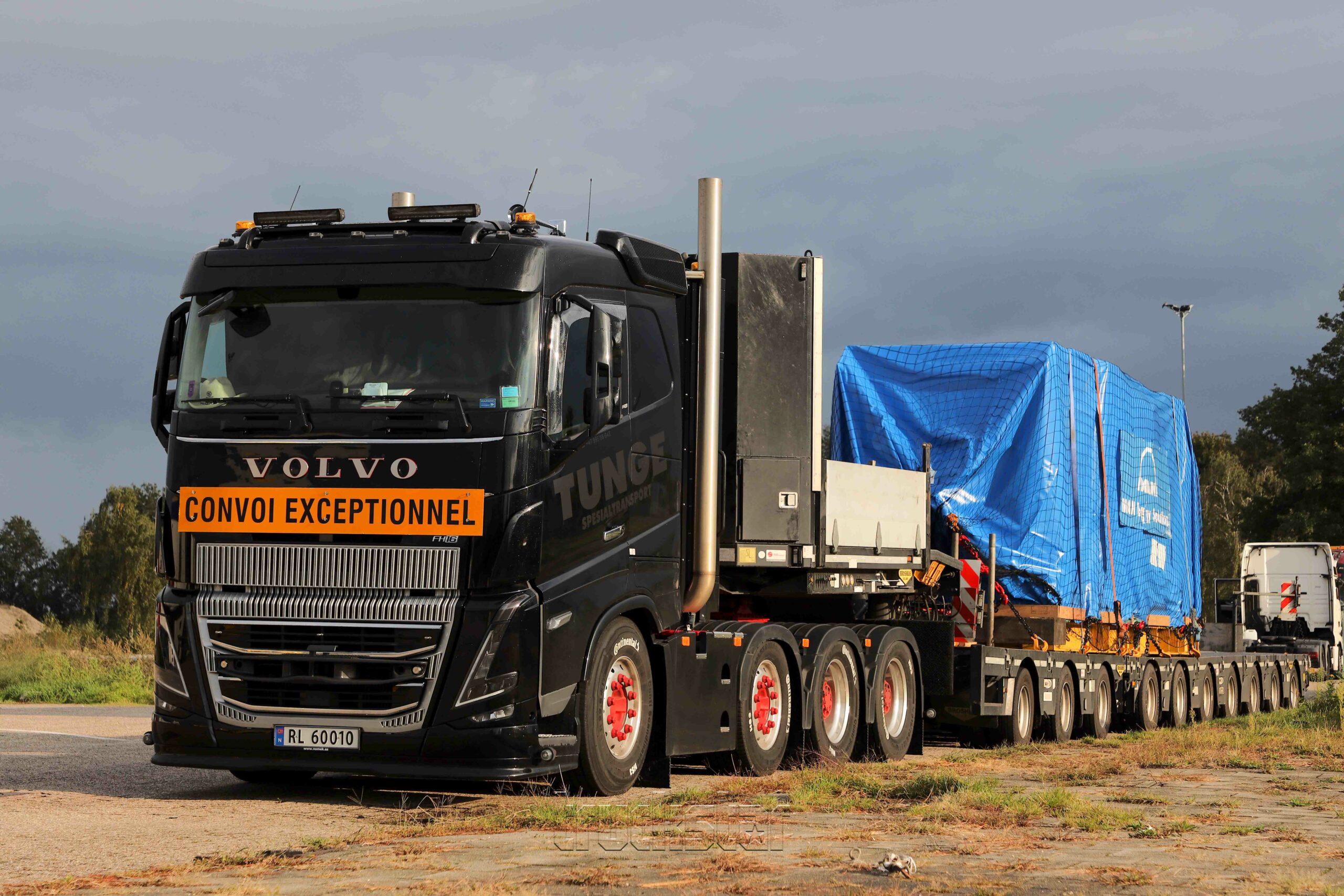 Een fraaie verschijning op de grensovergang is deze Volvo FH16 750 met Broshuis-3+7-semi van het Noorse bedrijf Tunge. De lading bestaat uit een generator van 73 ton die is bestemd voor Oslo.
