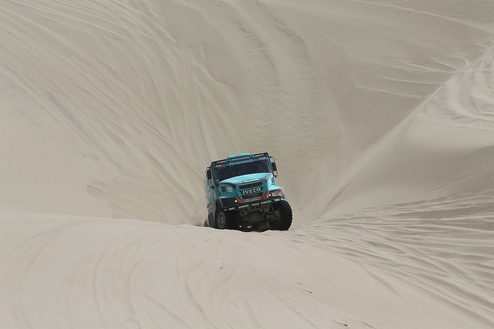 Het zijn de duinen in de Ica-woestijn die het verschil maken. De voorgaande jaren gingen de eerste etappes van de Dakar Rally over snelle WRC-paden en ging het om seconden, hooguit minuten. Nu wordt de top 10 in het klassement van de trucks al na twee etappes gescheiden door 48 minuten. ,,Toch wil ik niet nu al te veel naar die verschillen kijken”, zei Ton van Genugten, die vijfde staat op 20.50. ,,De komende dagen krijgen we nog veel meer duinen. Eén keer goed vast komen te zitten en je bent een uur kwijt.”