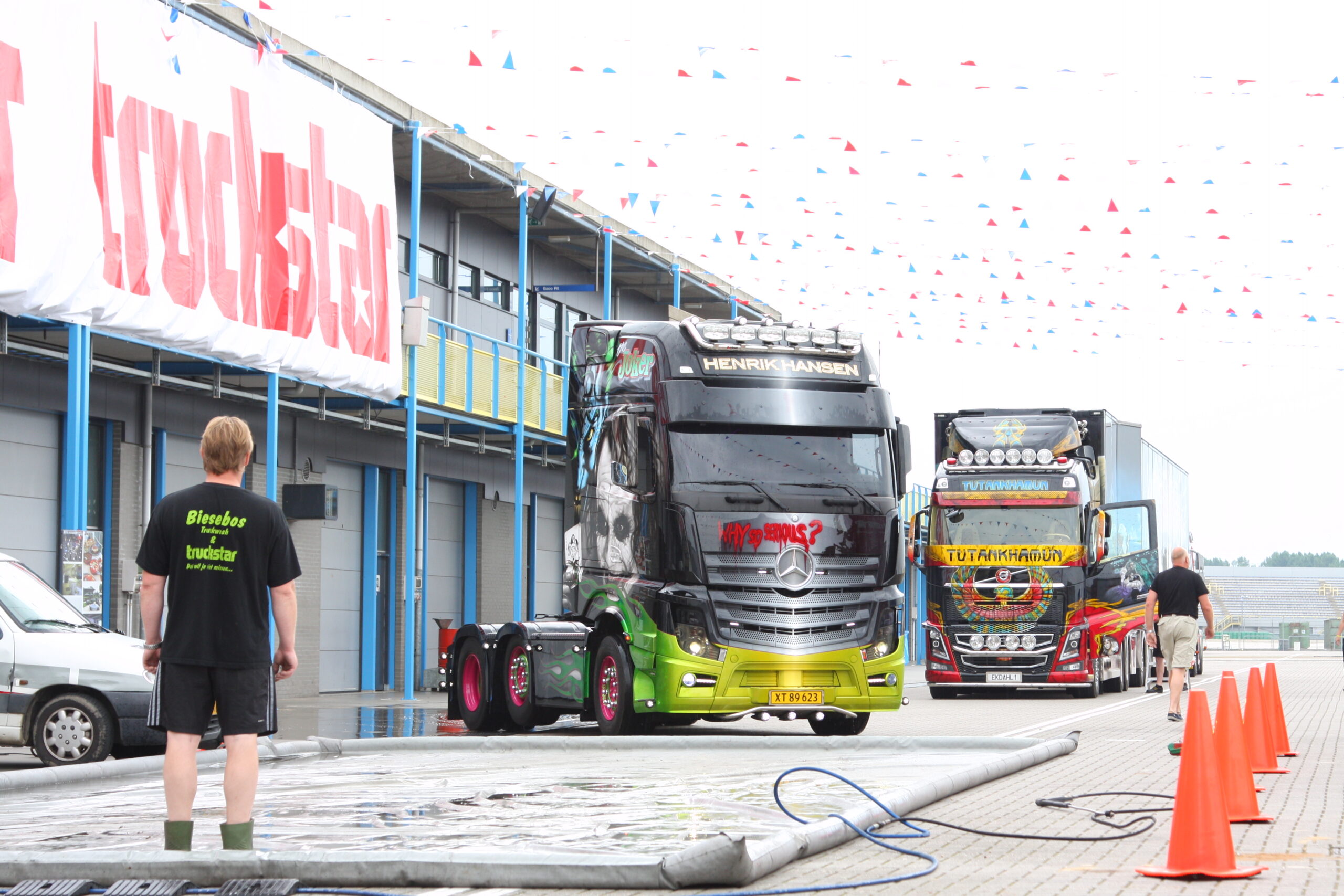 Tijdens het Truckstar Festival hebben we zo’n 500 trucks uit de speciale categorieën op de paddock staan. Die trucks komen nu binnen, en voor hen hebben we weer een wasstraat ingericht. Hier staan de heren professionals van Biesebos truckwash met hogedrukspuiten, handborstels en de juiste wasproducten de trucks na een – veelal lange – reis naar Assen weer helemaal op te frissen.
