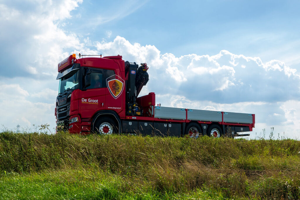 De Groot Bewerkingsmachines in Rosmalen nam onlangs een nieuwe Scania R520 6×2 V8 bakwagen met een gestuurde achteras en een HMF 50 tonmeter kraan in gebruik. Het bedrijf zet de auto in voor het vervoer van nieuwe en gebruikte machines van en naar klanten in Nederland en Vlaanderen. Daarnaast is het overduidelijk het visitekaartje van het bedrijf.