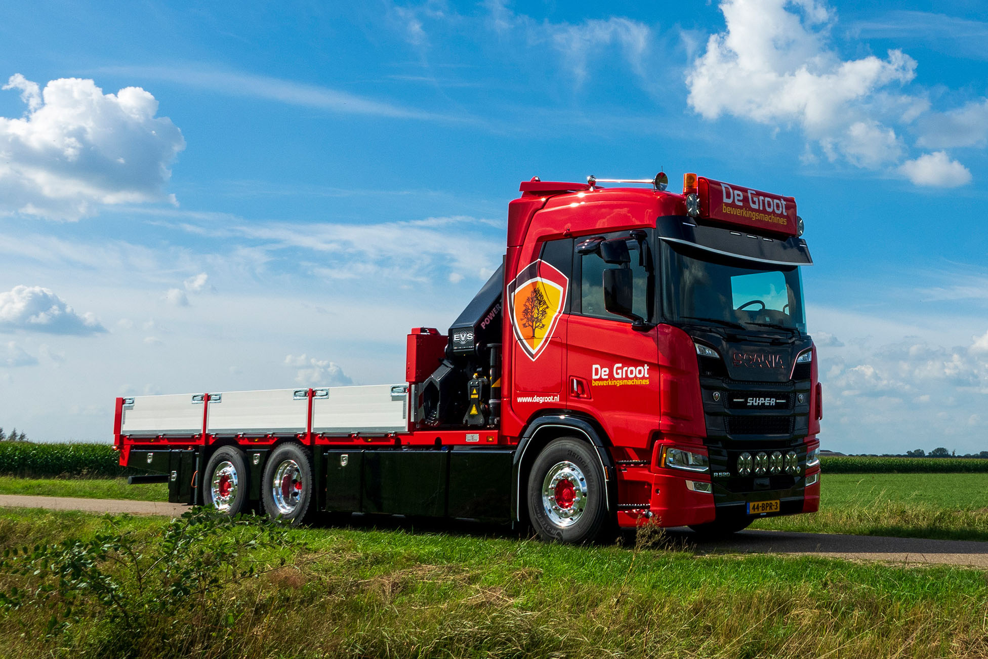 De Groot Bewerkingsmachines in Rosmalen nam onlangs een nieuwe Scania R520 6×2 V8 bakwagen met een gestuurde achteras en een HMF 50 tonmeter kraan in gebruik. Het bedrijf zet de auto in voor het vervoer van nieuwe en gebruikte machines van en naar klanten in Nederland en Vlaanderen. Daarnaast is het overduidelijk het visitekaartje van het bedrijf.