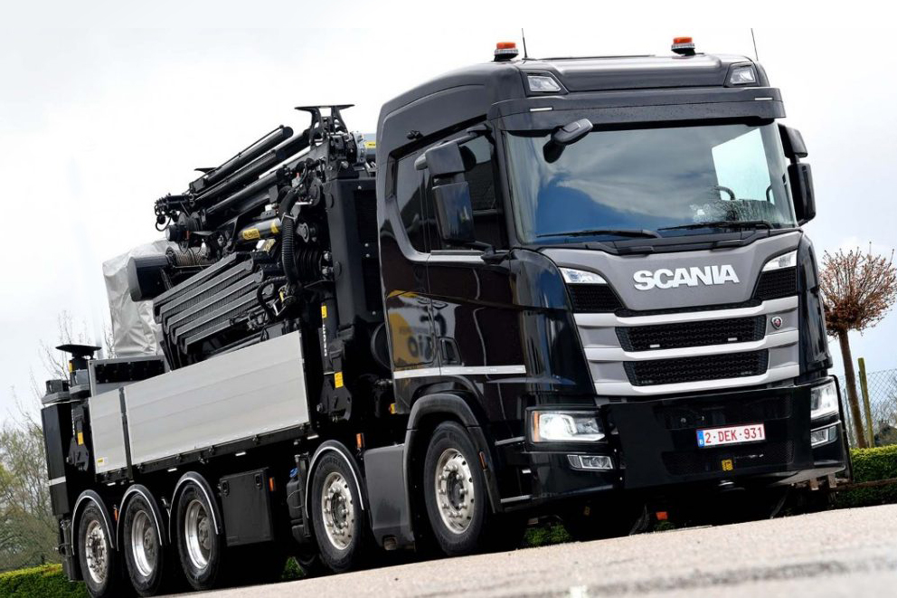Om die vraagstukken tot een goed einde te kunnen brengen, ging De Kraanman voor een bijzondere combinatie. “We kozen voor een Palfinger PK200002L-SH met JIB, de zwaarste kraan in zijn soort in België. Om hem te kunnen monteren, hadden we een vijfasser nodig. Scania is het enige vrachtwagenmerk dat die af-fabriek kan leveren in de specificatie die perfect aangepast is aan onze noden,” aldus Peeters, die een Scania 500R 10×4*6 bestelde.