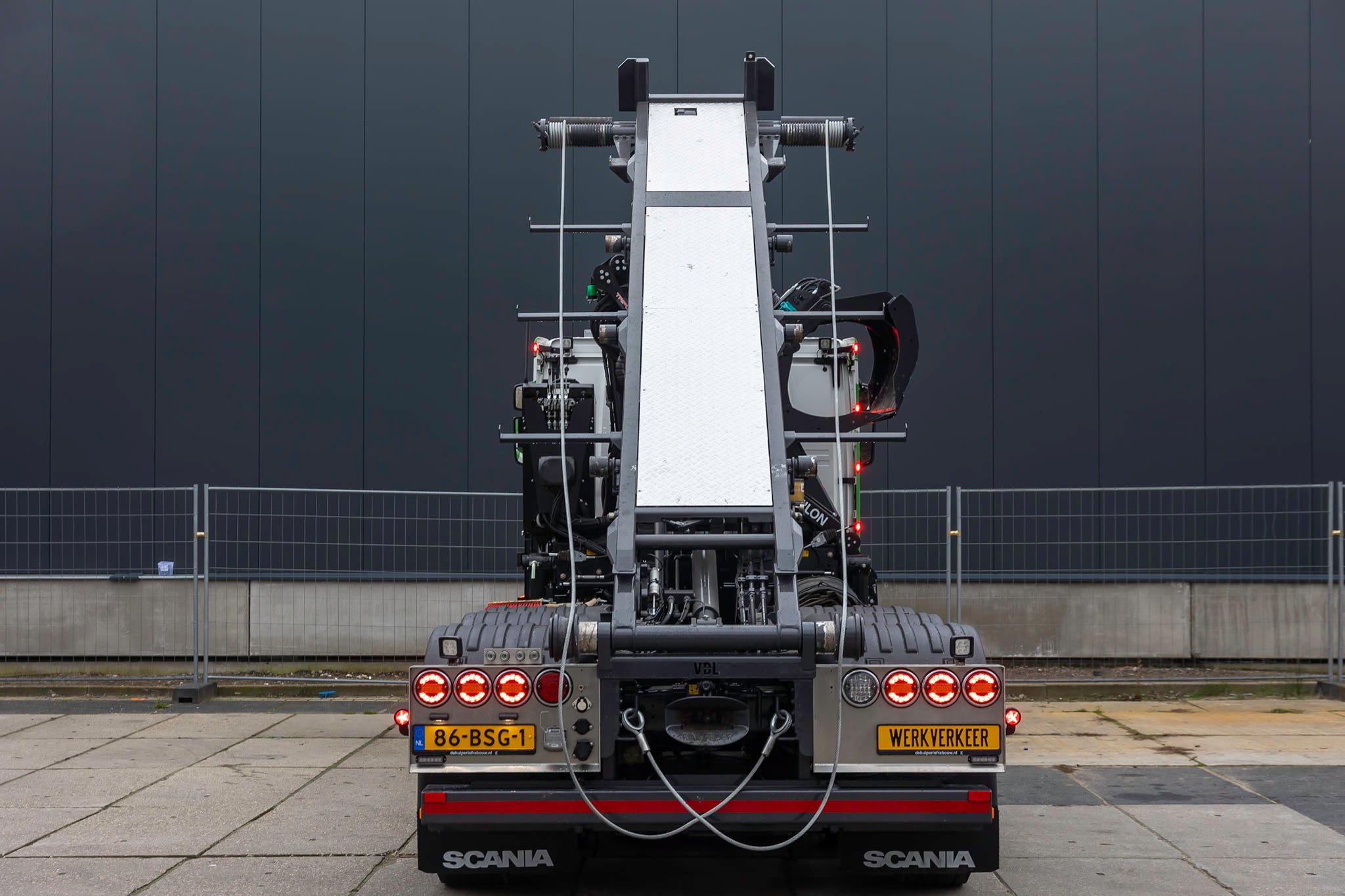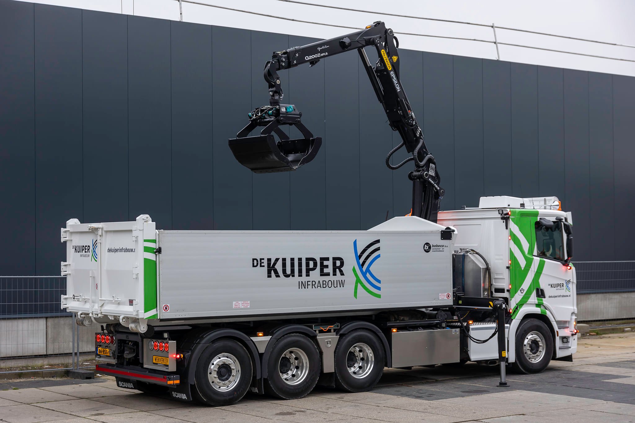 De rondom luchtgeveerde vierasser met 10 tons vooras vormt namelijk het onderstel voor een 25 tons kabelafzetbakinstallatie in combinatie met een Palfinger Epsilon Q200Z 95TRHPLS 20t/m kraan met een knijper. Deze opbouw werd door de firma J.L. Muns geleverd. Bijzonder is verder dat de men bewust koos voor het Scania Clutch on Demand systeem. Daarbij kan de chauffeur de koppeling van de normaal gesproken geautomatiseerd werkende versnellingsbak toch nog met de voet bedienen voor uiterst precies manoeuvreren. En ook wilde men dat de truck in de bodemsanering moet kunnen worden ingezet. “In dat werk gebruik je vaak een overdrukinstallatie. De unit daarvoor past niet achter de cabine in verband met de kraan. Daarom kozen ze voor een verlengde dag cabine met een laag dak. Zo hebben we een goede balans tussen voldoende ruimte voor de chauffeur en een niet te hoge opbouw zodat er eventueel ook nog voorover de cabine gekraand kan worden, En is er toch nog genoeg ruimte voor een klassieke lichtbak zonder dat er zo’n hoge puist op de auto staat. Ik vind het voertuig zo heel mooi in balans.”