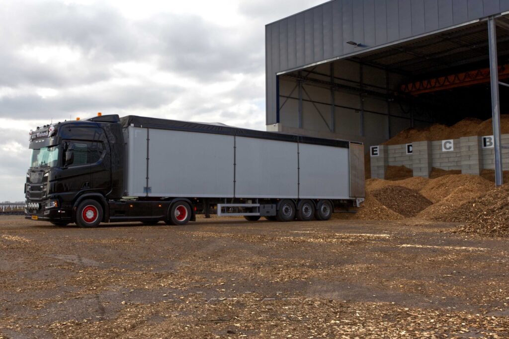 Het is iets voor zevenen als we arriveren bij de boer in Kloosterhaar. Het terrein ziet er verlaten uit, maar na het aanbellen bij het tweede huis op het erf komt de boer naar buiten. De aardappelen moeten in een schuur die achterop het erf staat. Wielsma mag zijn stuurmanskunsten laten zien. Binnen een half uur zijn de aardappelen eruit en rijden we naar het volgende laadadres. Bij Coevorden mogen we houtsnippers laden. Langs een smal landweggetje zijn bomen gekapt. Een berg snippers is daarvan overgebleven. De JCB-verreiker kan met het laden beginnen en een dik half uur later staan de koppen op de lading. Jan klimt naar boven en verdeelt met een hark de houtsnippers, zodat het zeil erover kan en alles keurig onder de vier meter blijft. Deze lading mag naar een biomassa-energiecentrale bij IJsselmuiden. Daar wordt uit dit restproduct elektriciteit opgewekt voor de vele kassen in dit gebied. Ook vader Jelle Wielsma mag daar een vracht houtsnippers lossen.