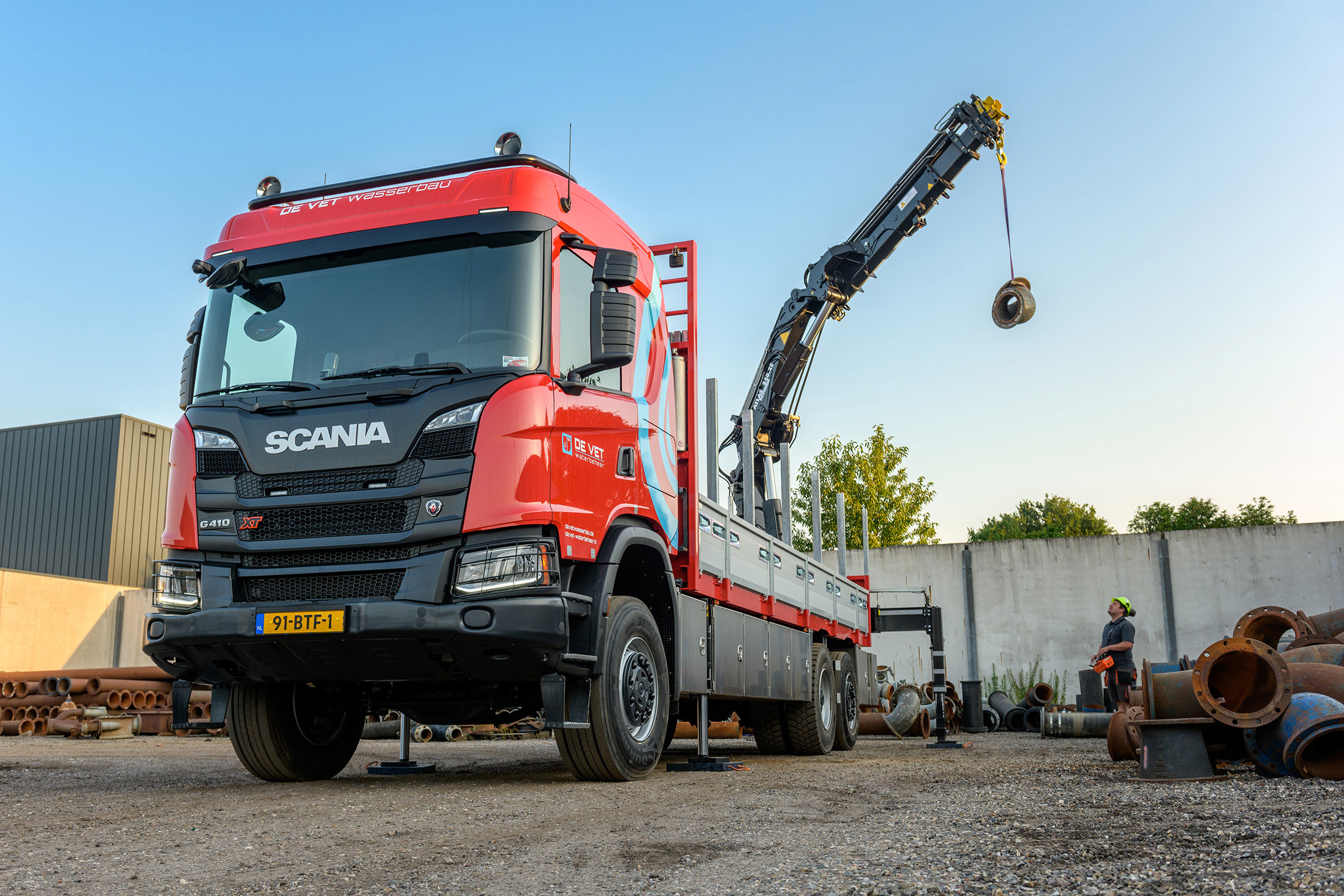 Bronbemalingsspecialist De Vet Waterbeheer met vestigingen in Mill en Goch (Duitsland) neemt een nieuwe Scania G410 als 6×4 met een gestuurde hefbare naloopas in gebruik. Het is de vijfde Scania binnen een wagenpark van acht voertuigen. De Vet koos opnieuw bewust voor het Zweedse merk omdat Scania als enige af fabriek de voor De Vet ideale configuratie kan leveren.