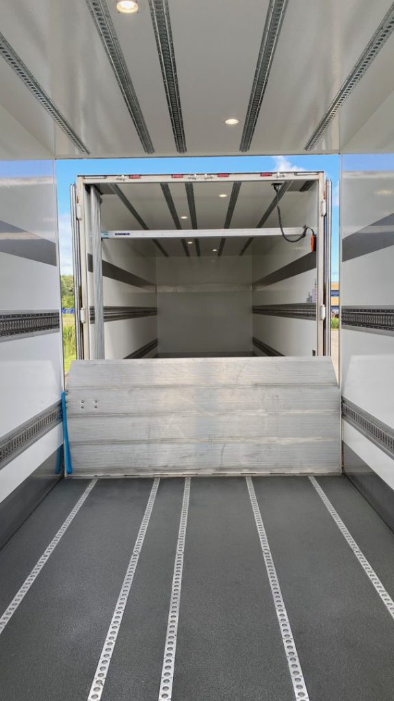 De wide-spread Heiwo middenas aanhangwagen heeft aan de voorzijde ook harmonica deuren met daarachter de zware 30 mm overrijdplaat voor het doorladen. Ook deze AHW is voorzien van een D’hollandia laadklep.