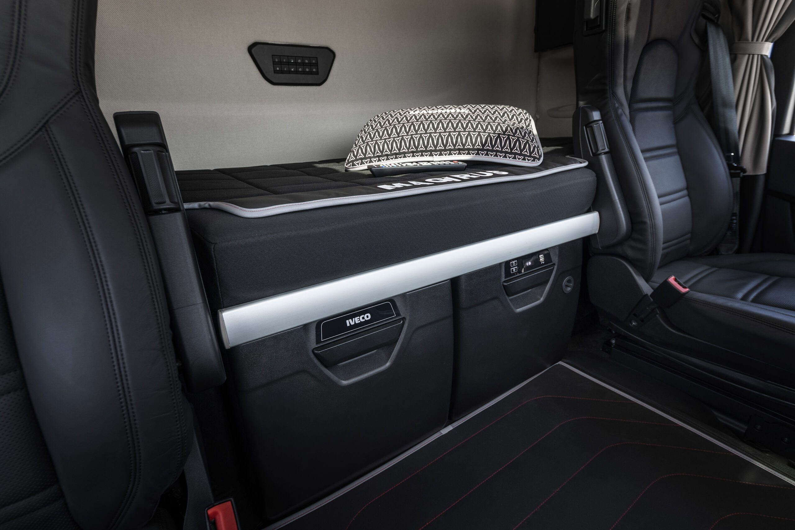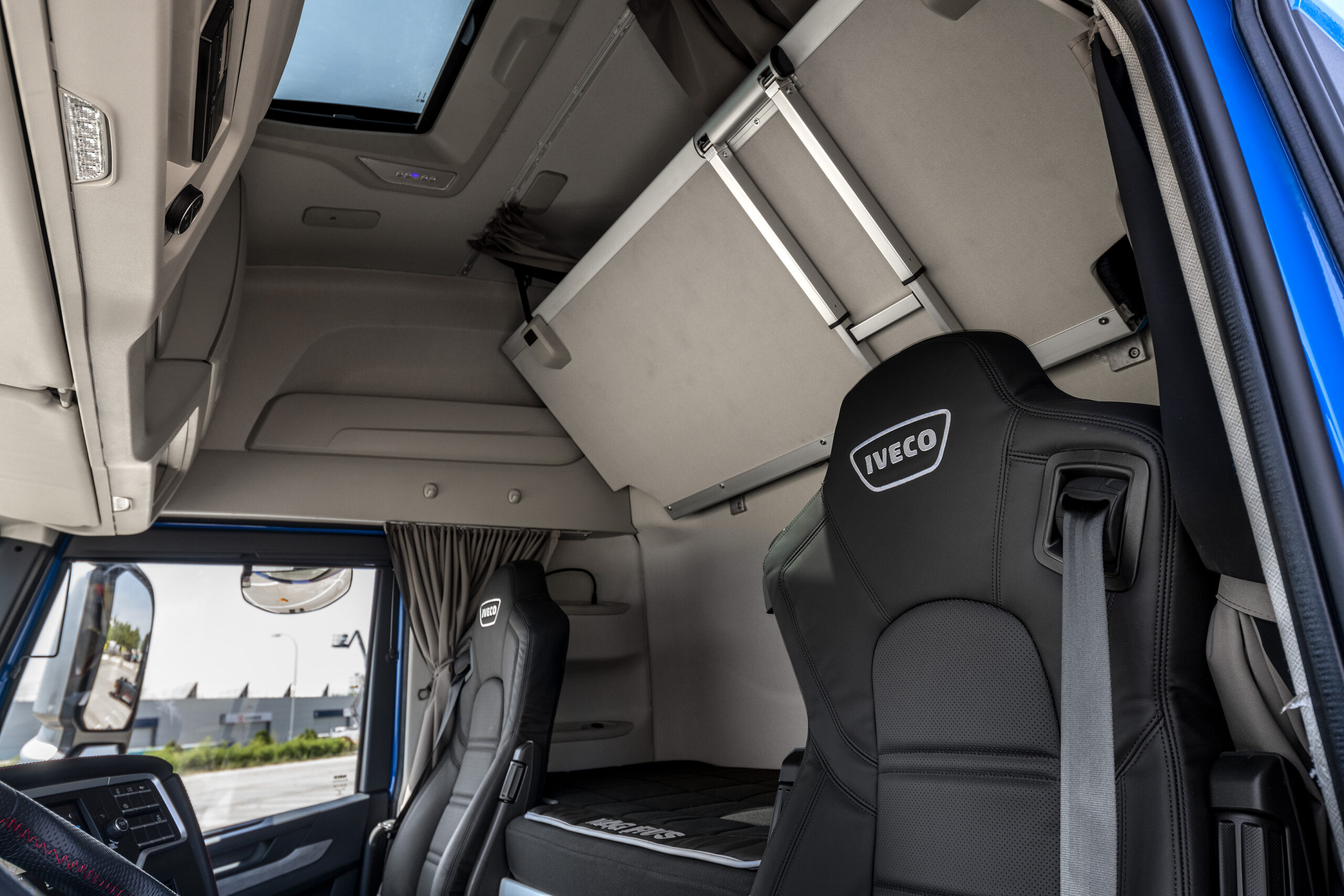 Het geheel nieuwe interieur biedt stahoogte tot 2,15 meter. Onder het brede onderbed met 14 cm dik matras passen twee koellades en boven de voorruit zitten drie grote opbergvakken van in totaal 250 liter. Het stuurwiel heeft 22 knoppen waarmee nagenoeg alles te bedienen is, inclusief de diverse veiligheids- en assistentiesystemen. De middenconsole is duidelijk naar de chauffeur gedraaid en heeft onder meer een 7 inch touchscreen voor onder meer de navigatie. Maar hierop kun je ook het state-of-the-art infotainment system met Apple Car Play bedienen. Er zijn vier cupholders, usb aansluitingen en een extra lade waar A4 formaat papieren in passen. Als optie kan een uitklapbaar schrijftafeltje rechts worden bijbesteld. De LED interieurverlichting is volledig dimbaar en kan op verschillende standen worden gezet. Net als DAF heeft de nieuwe S-way ook een night lock functie op de deuren tegen ongenode gasten.