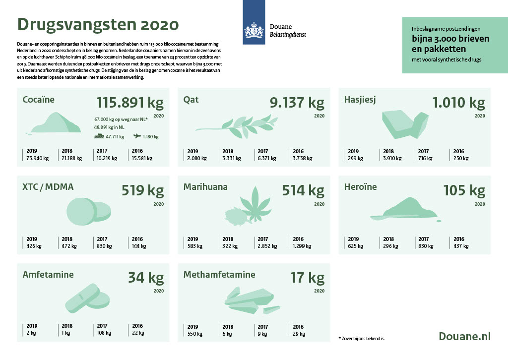 Douane- en opsporingsinstanties in binnen- en buitenland hebben in 2020 ruim 115.000 kilo cocaïne bestemd voor Nederlandse havens onderschept. Alsmede in beslag genomen. Nederlandse douaniers namen hiervan in de zeehavens en op de luchthaven Schiphol ruim 48.000 kilo cocaïne in beslag. Dit is een toename van 24 procent ten opzichte van 2019.