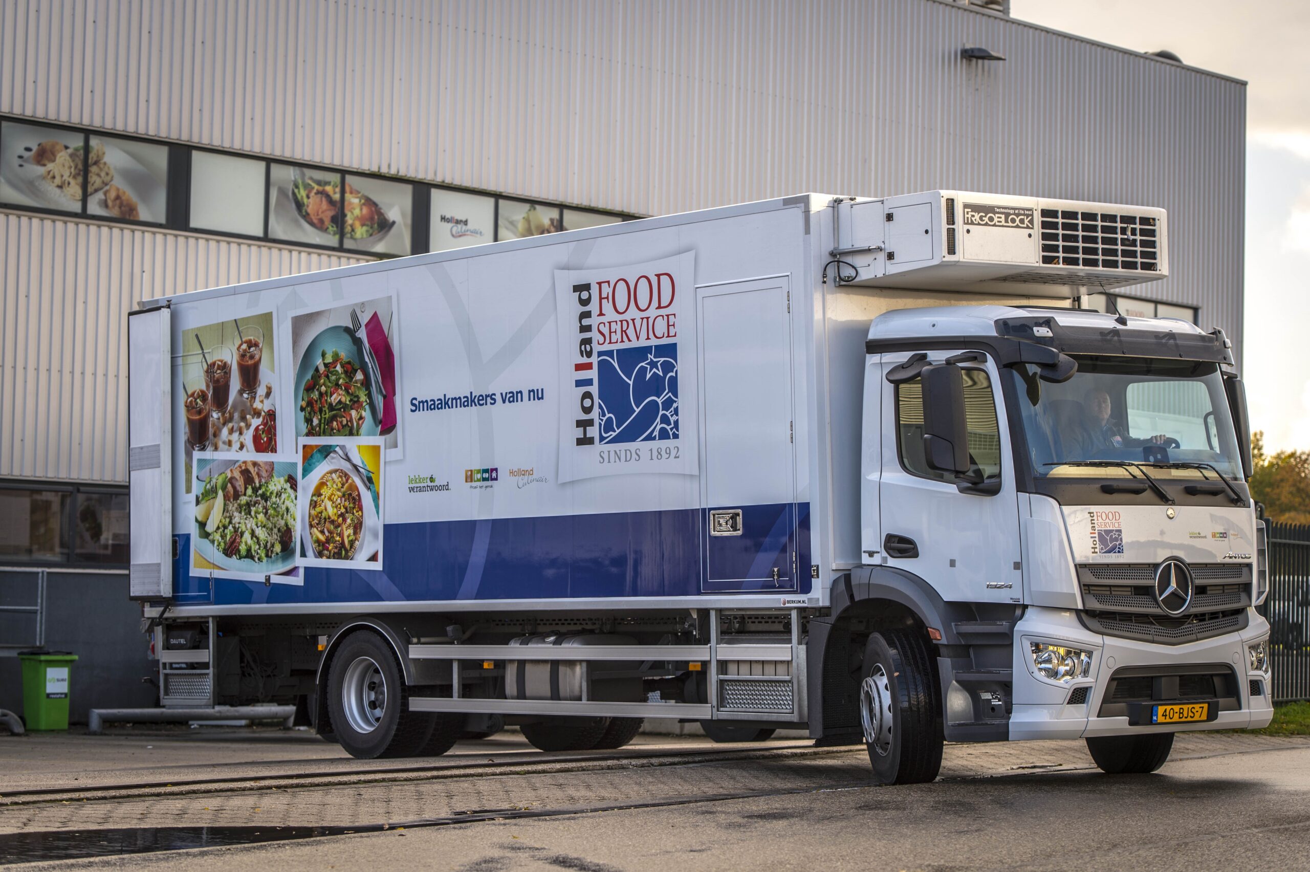 De trucks zijn voorzien van een geïsoleerde opbouw met twee compartimenten, zodat zowel gekoelde als diepgevroren producten meekunnen. De daarvoor gebruikte Frigoblock FHL 25 I koelunit wordt aangedreven via de 7,7 liter motor van de Antos. ,,Het machineverbruik is daarmee 15 procent zuiniger en zo stil mogelijk om overlast tijdens de bevoorrading tot een minimum te beperken’’, claimt Frank Kampschreur, directeur van Holland Food Service. De nieuwe vrachtwagens worden geleast via Mercedes.