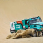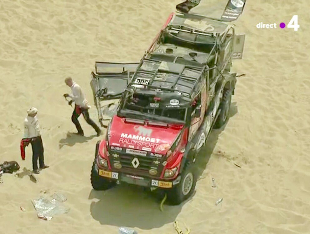 Een zwaar ongeval gisteren voor de Renault Sherpa van Martin van den Brink van Mammoet Rallysport. Bij het oprijden van een duin ging het mis. De motor miste vermogen waardoor de top niet gehaald werd en de truck achteruit het duin afrolde. Hierbij ging de Renault vier keer over de kop. Gelukkig raakte niemand gewond. Sterker nog, Van den Brink gaat vandaag gewoon weer van start voor de derde etappe, zo meldt het team op twitter.