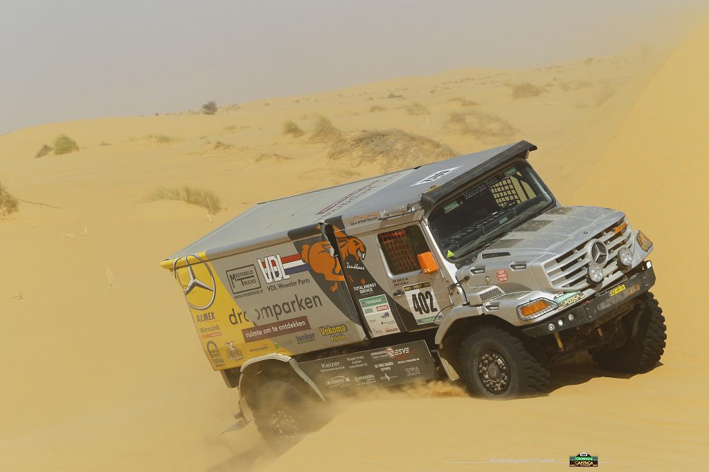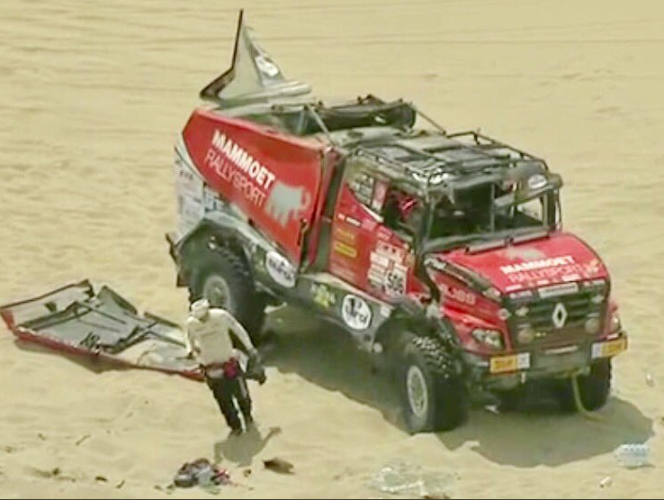 Een zwaar ongeval gisteren voor de Renault Sherpa van Martin van den Brink van Mammoet Rallysport. Bij het oprijden van een duin ging het mis. De motor miste vermogen waardoor de top niet gehaald werd en de truck achteruit het duin afrolde. Hierbij ging de Renault vier keer over de kop. Gelukkig raakte niemand gewond. Sterker nog, Van den Brink gaat vandaag gewoon weer van start voor de derde etappe, zo meldt het team op twitter.