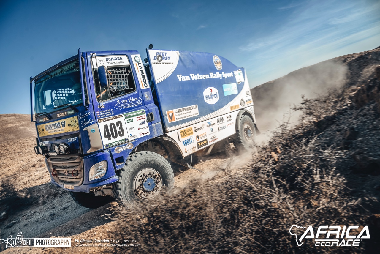 Maar ook in Afrika wordt op dit moment een rally verreden, de Africa Eco Race. En ook daar strijden Nederlanders voor de eer. De Eco Race startte al op 1 januari in Monaco en eindigt zondag 13 januari in Dakar, eigenlijk zoals dat bij de eerste edities van de echte Dakar rally ook het geval was. Na zeven etappes staat Aad van Velsen met zijn Ginaf op de tiende plek in het algemeen klassement en is daarmee de beste Nederlander. Vlak erachter neemt Johan Elfrink plek elf in met zijn Mercedes-Benz.