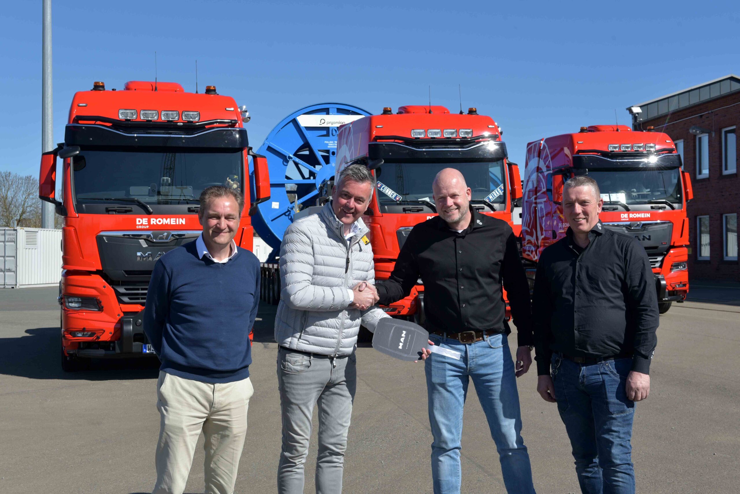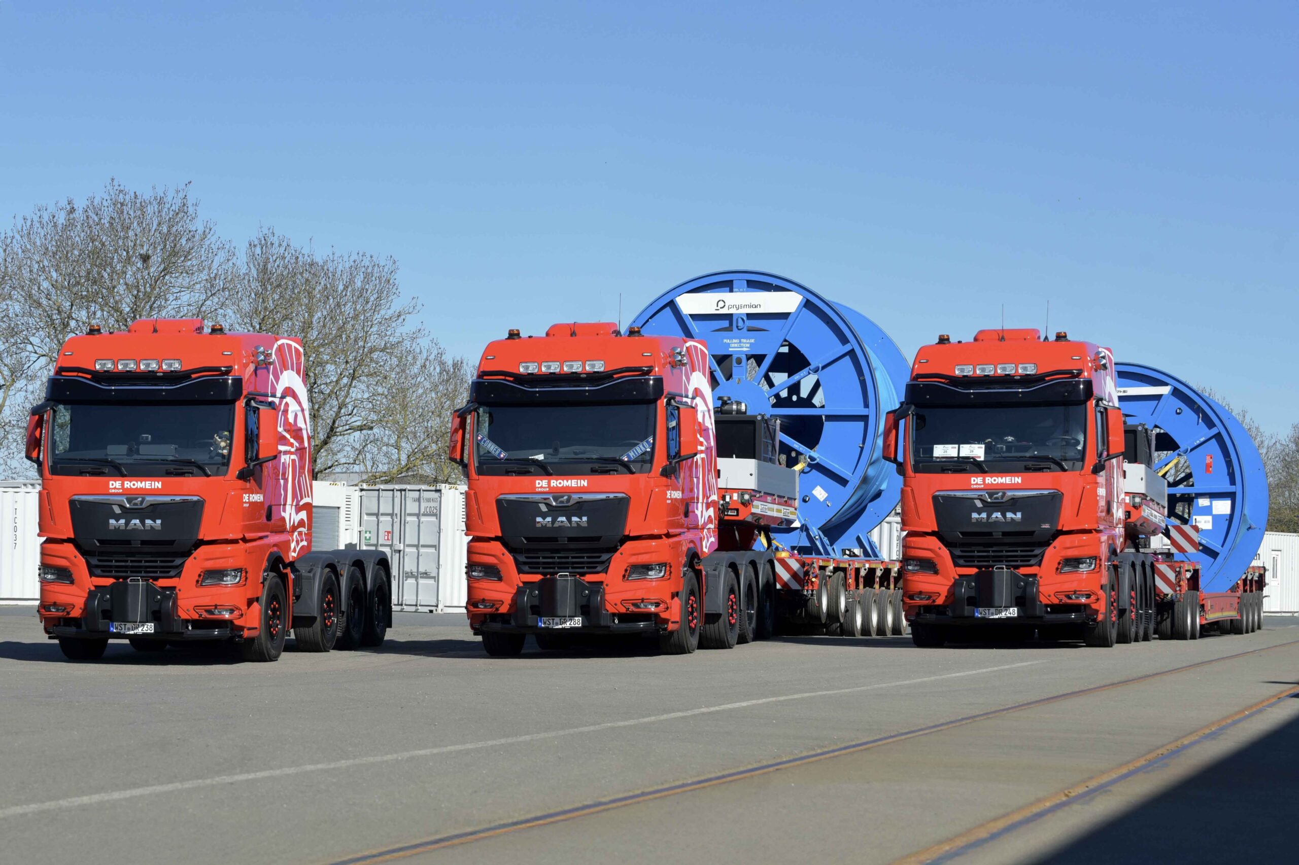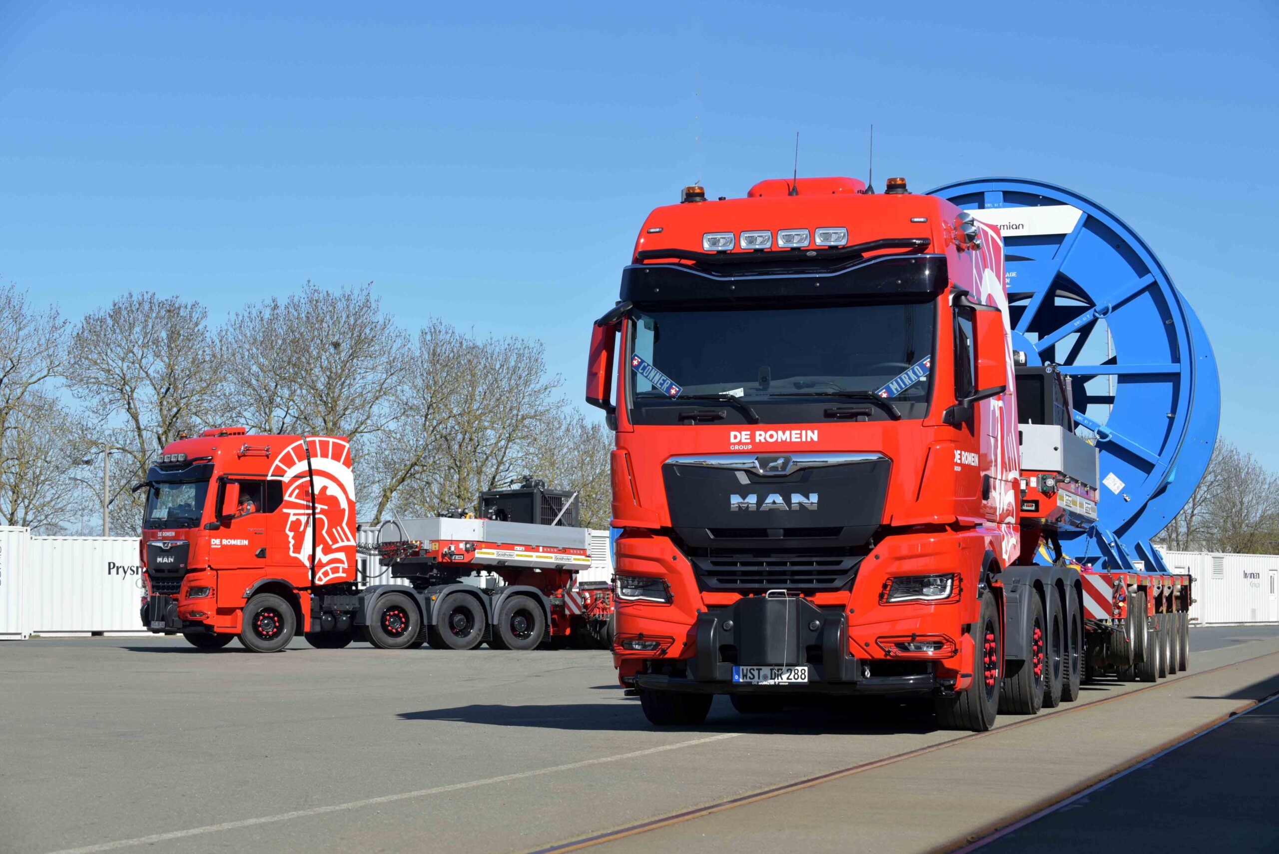 Voor het transport van kabelhaspels tot maar liefst 97 ton was er behoefte aan nieuwe zwaar-transporttrekkers. Ronnie Blokzijl, mede verantwoordelijk voor het machine- en wagenpark van De Romein: “Wij hebben een vloot van dertig trucks, maar die schoten tekort voor dit project. Samen met MAN Nederland en Sommerauer Trucks, onderdeel van Wierda Bedrijfswagens, zijn vervolgens deze drie trucks samengesteld.”