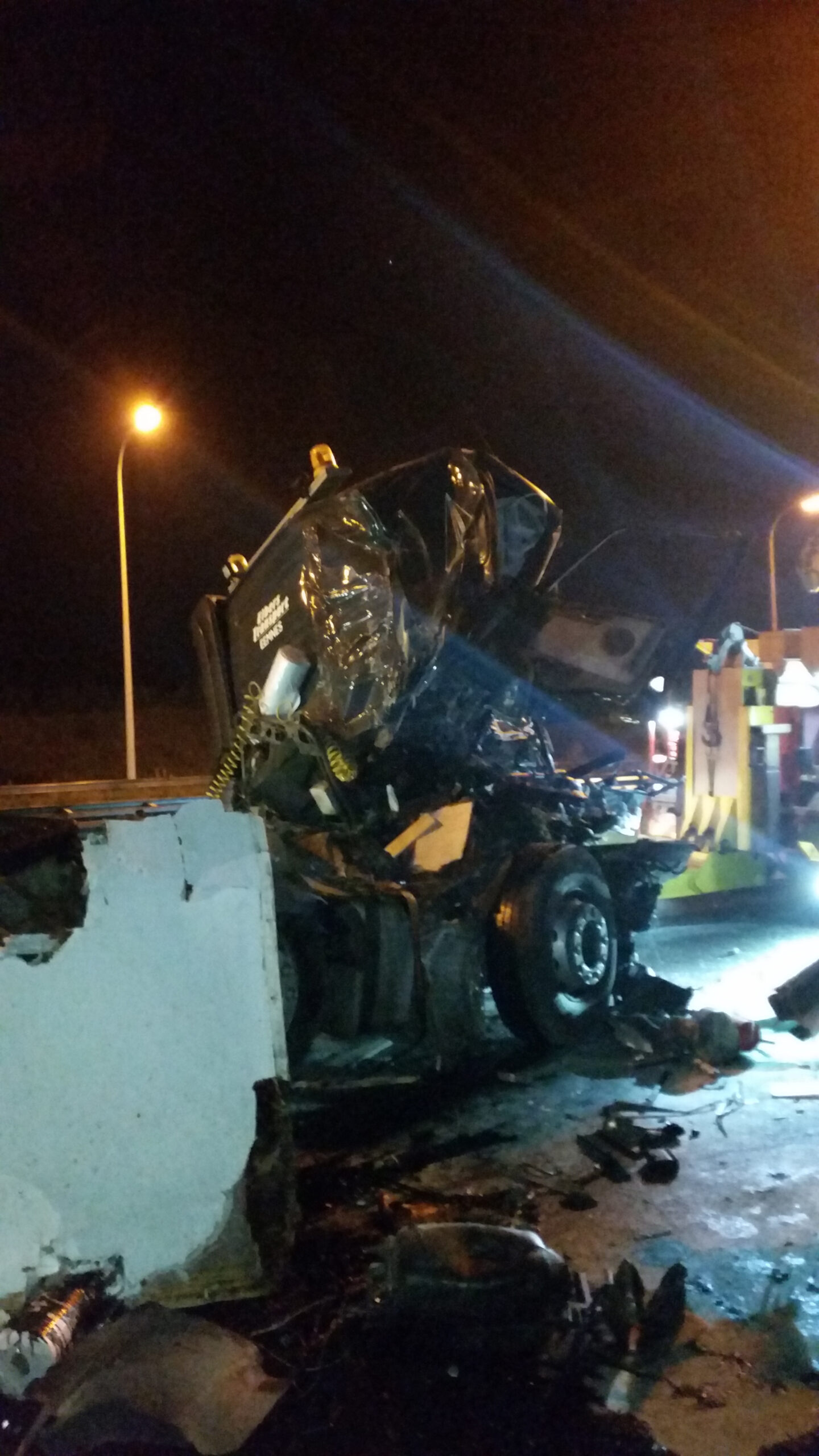 De ravage was gigantisch. Van Richards Volvo FM voorloopastrekker was weinig meer over. Toch wist hij vrijwel ongedeerd via de voorruit uit de truck te klimmen.