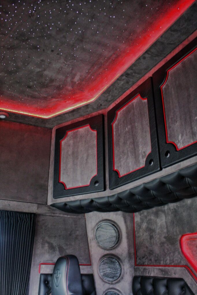 Binnen is alles leer wat de klok slaat. Zelfs de vloerbedekking. Ook het dashboard is gespoten door Truckstyling Lunteren. “En alle knoppen zijn gedipt”, vullen Gerrit en Cornelis aan. “Bovendien hebben we een sterrenhemel laten inbouwen. Alleen het met leer beklede stuurwiel is origineel gebleven. En verder is hij natuurlijk helemaal perfect uitgerust met een high-end geluidsinstallatie met subwoofer, ingebouwde koffiezetter, kastenwand achterin, en zelfs luidsprekers in het kopschot voor muziek tijdens het laden en lossen van de machines.” Tevens heeft Vlastuin Truckopbouw uit Renswoude de auto voorzien van staande uitlaten en een gladde achterwand.