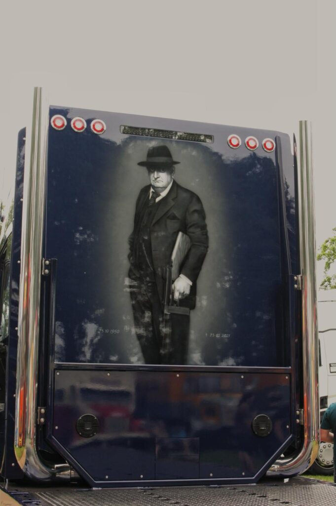 Hofman Trading is een echt familiebedrijf. Want naast Gerrit en Cornelis werken ook zijn vader Johannes en enkele neven in het bedrijf. “En op de achterwand staat een special paint van mijn Opa Gerrit, deze is tot in detail met airbrush gespoten door Willeke van MW-designs” vertellen de jonge ondernemers trots. “We hebben hem laten uitbeelden in de kleren van de Netflixserie Peaky Blinders.” Dat idee kwam omdat we een keer een fotoshoot met de familie in die stijl gedaan hebben. Wat we met Peaky Blinders hebben? Nou eigenlijk niet zo veel, maar we vonden de outfit heel mooi passen.”