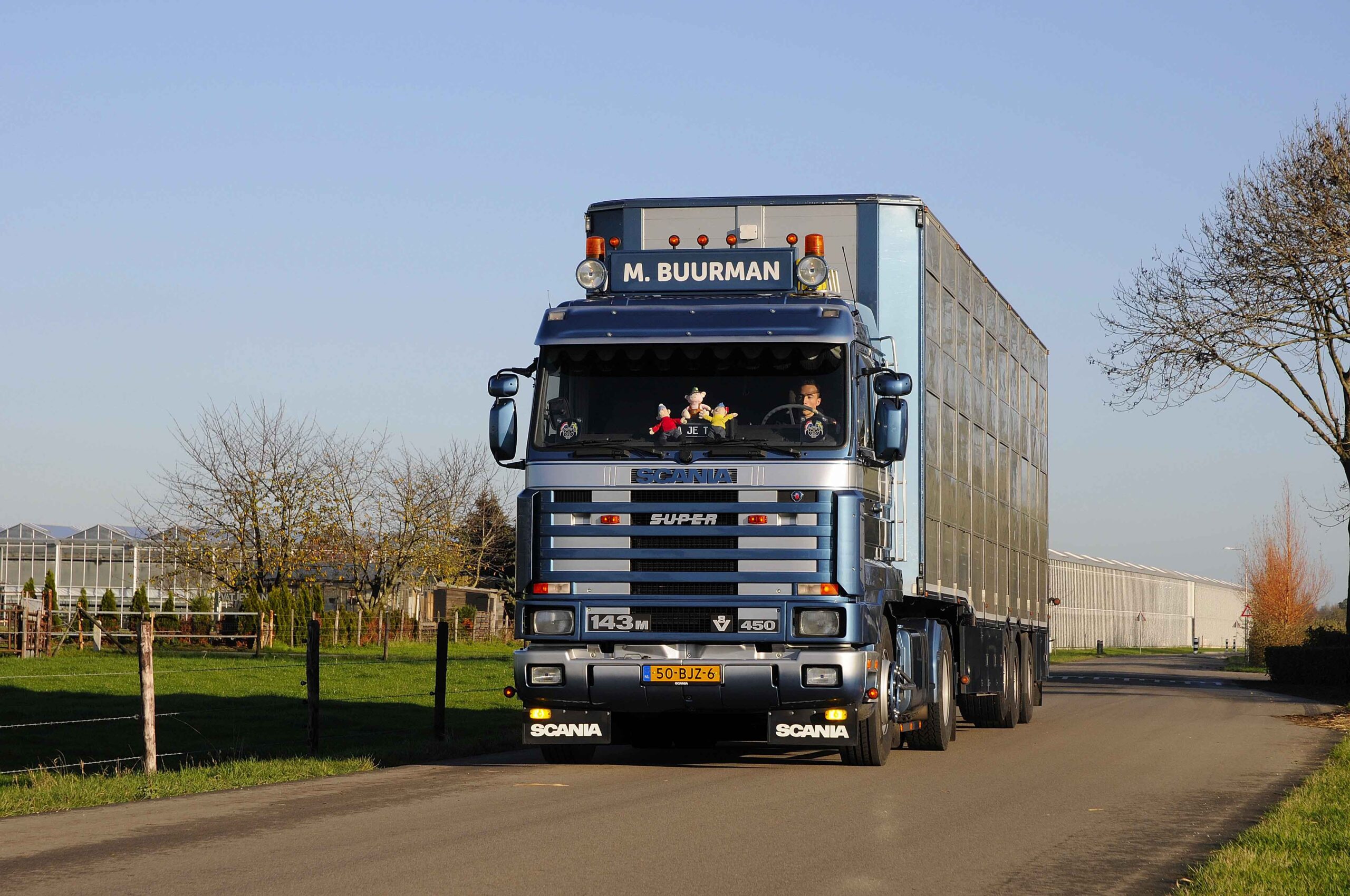 In de categorie bijzondere voertuigen ontwaren wij een met een smartphone gemaakte foto van een fraaie en nog altijd actieve Scania 143 450 van bouwjaar 1995. De Scania voldoet aan alle eisen van de old skool, zoals het kratje bier in het zeilenrek boven op het cabinedak. De chauffeur blijkt Mike Buurman te heten. We verwachten een door de jaren heen gelouterde forse stuurman, maar maken geheel coronaproof kennis met een negentienjarige jongeling. Deze Mike was in 2019 zelfs geruime tijd de jongste chauffeur van onze polder. Ik ontmoet Mike Buurman en zijn fraaie Scania 143 450 op de werf van het familiebedrijf, dat is gevestigd in het Gelderse dorp Angeren. Mike is actief in het veevervoer. Aan de schotel van de Scania bungelt een keurige Berdex-oplegger met drie verdiepingen van bouwjaar 2012. De drieassige Berdex heeft een lift- en stuuras en is speciaal ingericht voor het transport van varkens en biggen.