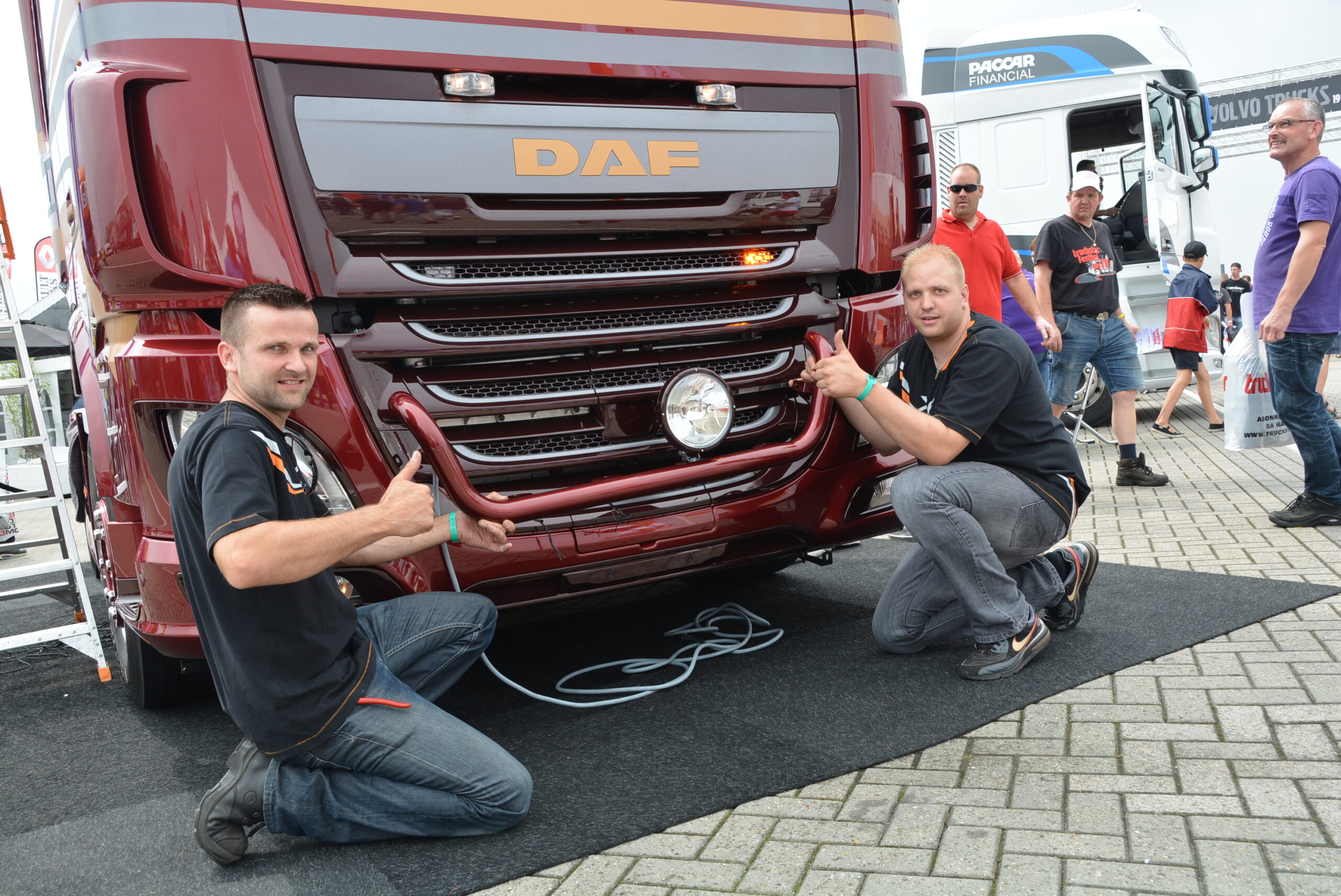 Op de stand bij DAF lijkt het misschien alsof de meest prominent aanwezige truck, een bordeaux rode XF nog niet af is. Dat doet het merk echter met voorbedachte rade. De XF wordt óp het Festival opgebouwd door monteurs Ronald Santing en Peter Wolken van DAF-dealer Sent-Waninge uit Assen. Ronald: “We maken er iets bijzonders van, puur met onderdelen uit de TRP-parts catalogus van DAF.” Een lampenbeugel en een aantal extra led-lampen zijn op zaterdag inmidddels bevestigd. DAF wil hiermee onderdelenprogramma TRP, dat inmiddels 20 jaar bestaat onder de aandacht brengen en laten zien wat er allemaal mogelijk is op het gebied van truckopbouw. Strak wordt de auto zeker, en voor de liefhebbers: hij te koop! Mocht je trouwens even zonder energie zitten, dan hebben we een goede tip voor je: vraag dan op de DAF stand om een blikje originele TRP-energy drink.
