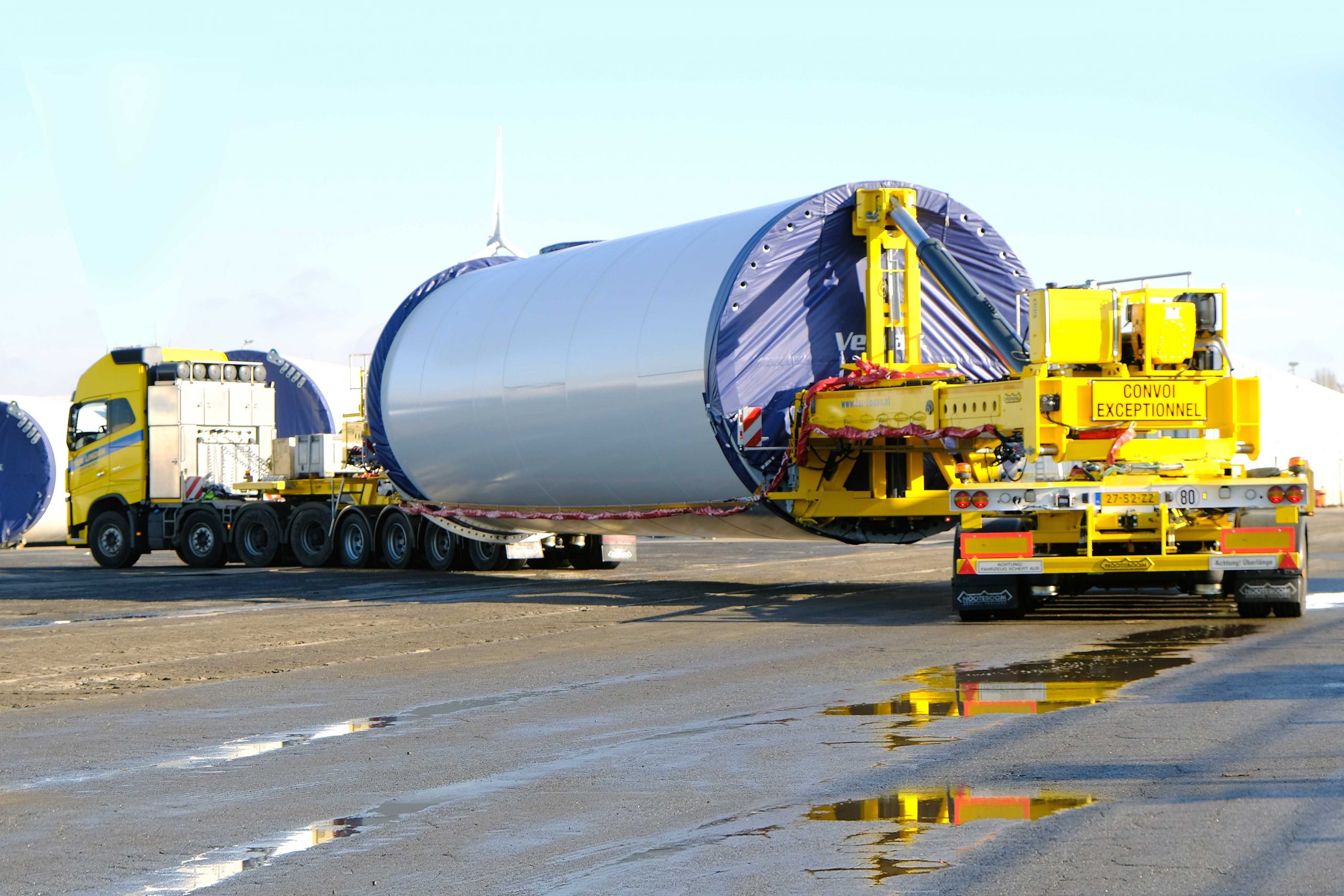 De grotere diameters van de torendelen stellen andere eisen aan de gekozen transportoplossing. Zo is het zwaartepunt van de lading tijdens het transport veel hoger komen te liggen. Een grotere stabiliteit is daarom noodzakelijk om de torendelen, met een gewicht tot 100 ton, veilig over de weg te kunnen vervoeren. Zelfs bij hoge snelheid tot 80 km/u.