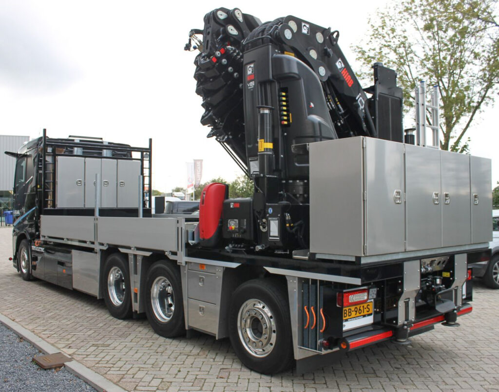 Het betreft een Volvo FH Aero Electric met een 8×4-chassis, wide spread-gestuurde naloopas en een luxe cabine. Achterop staat een indrukwekkende HIAB iQ 1188 E-9-kraan (120 tonmeter) met Jib 155 Q-6. De kraan heeft een bereik van 36,2 meter en is negen keer uitschuifbaar.