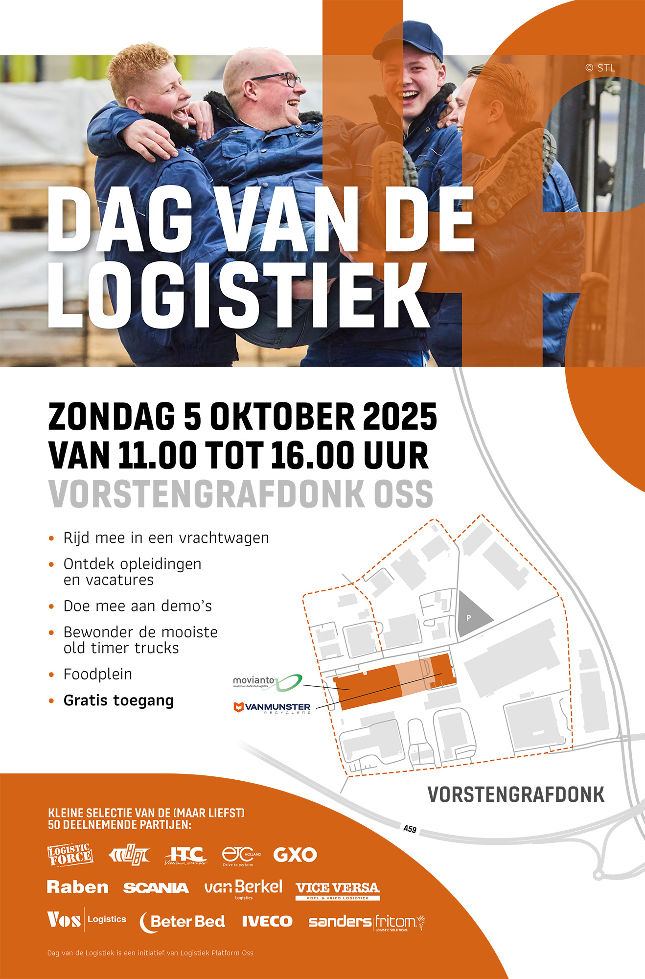 De Dag van de Logistiek wordt dit jaar voor de vierde keer georganiseerd door Logistiek Platform Oss, in samenwerking met een groot aantal logistieke bedrijven. Movianto en Van Munster Recyclers, buren van elkaar op bedrijventerrein Vorstengrafdonk, zetten hun deuren open voor een kijkje in de keuken. Andere logistieke bedrijven zijn aanwezig met een stand. Op het carrièreplein en het demoplein laten zij zien wat ze allemaal in huis hebben. Er zijn interessante demo’s en interactieve workshops en bezoekers kunnen ervaren hoe het is om als bijrijder in een vrachtwagen te rijden.