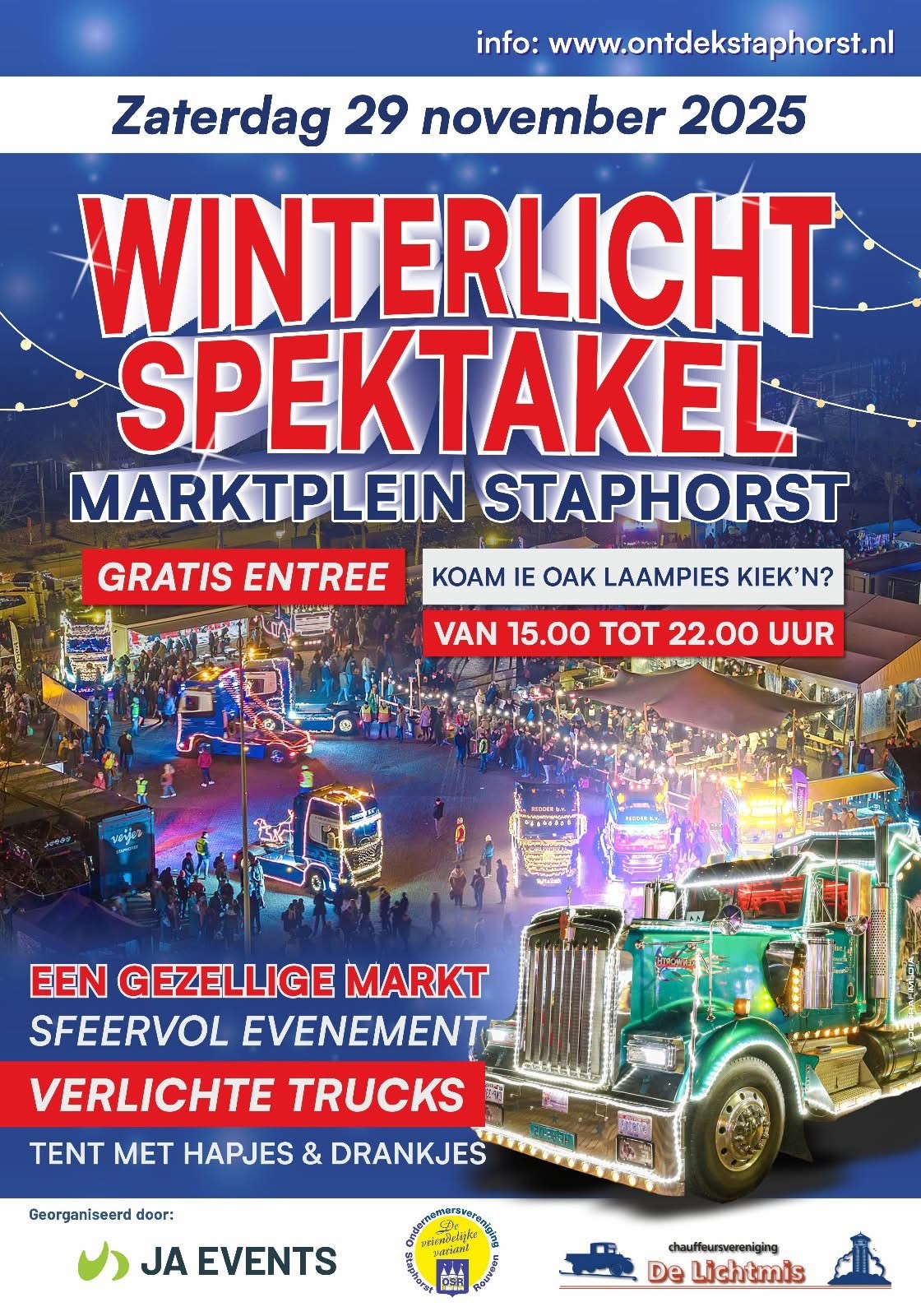 Kom gezellig naar het sfeervolle Winterlicht Spektakel op het Marktplein in Staphorst! Tussen 15:00 en 22:00 uur beleef je een sfeervol evenement vol licht, muziek en gezelligheid.