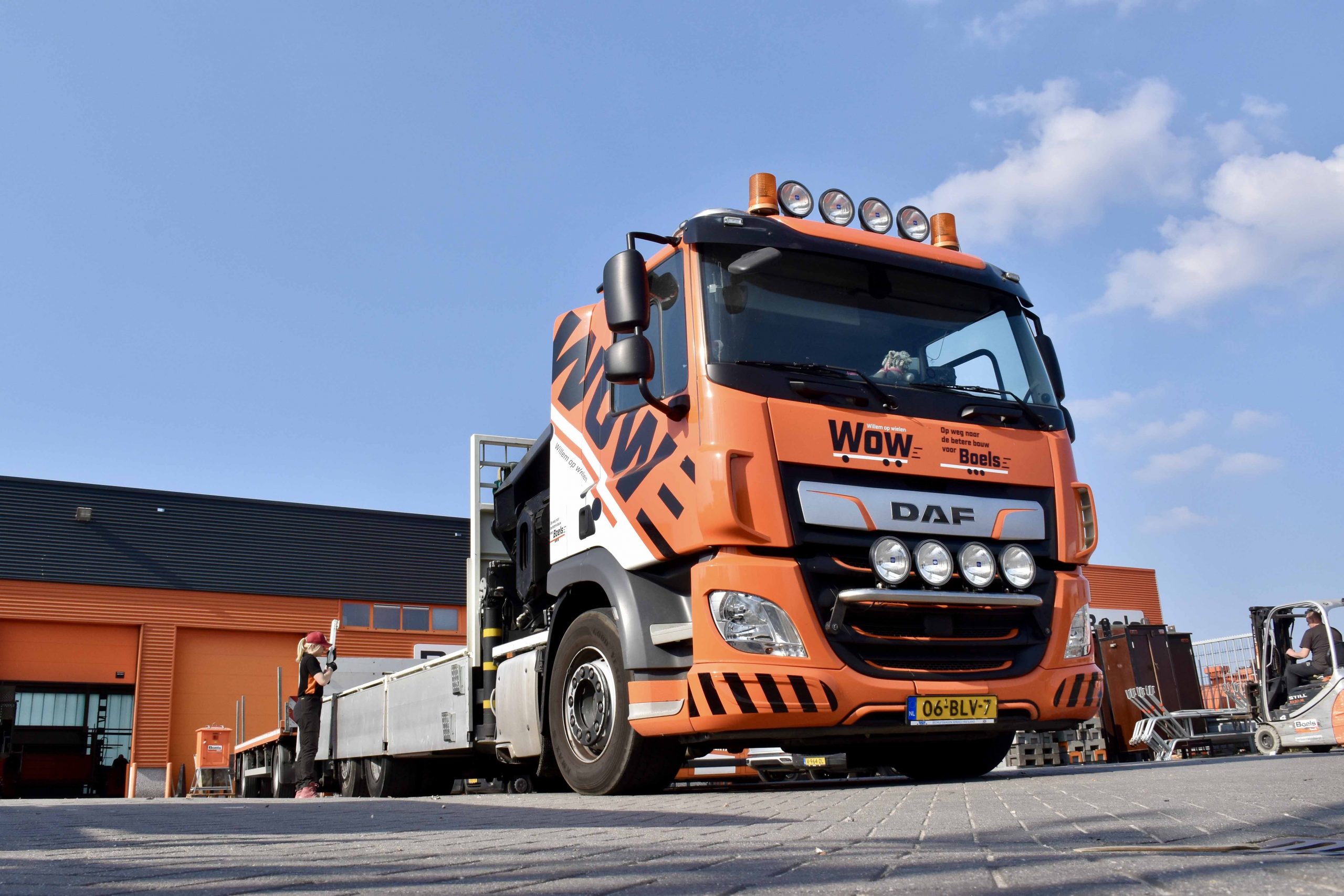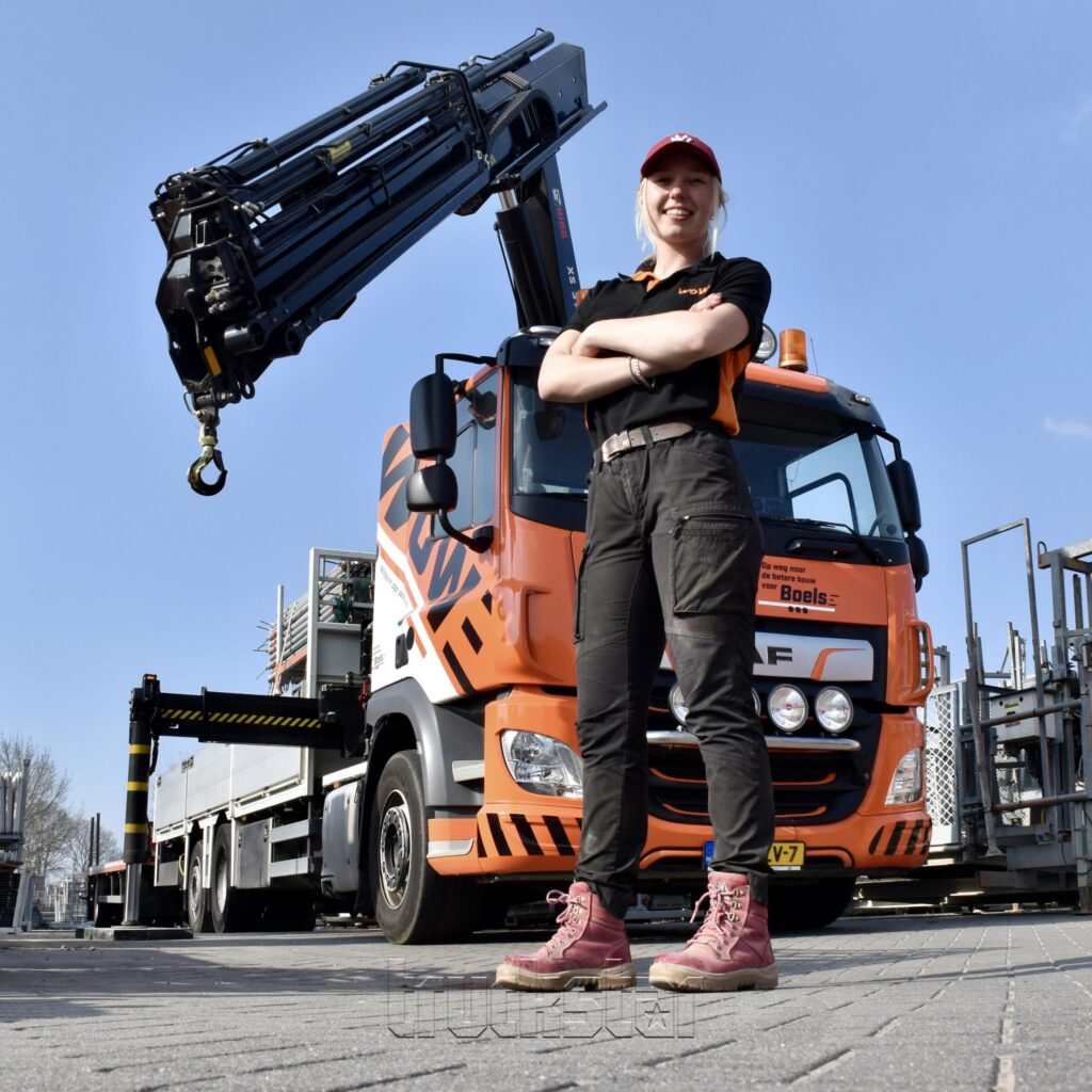 Het was eigenlijk helemaal niet Fabiennes bedoeling om chauffeur te worden. “Ik heb er zelfs nooit aan gedacht,” zegt ze. “Maar toen ik mijn opleiding Sport en Beweging had afgerond, kwam ik een keer toevallig bij WoW om iets te halen of te brengen. Toen liep ik de directeur tegen het lijf, die mij vroeg of ik niet chauffeur wilde worden. Ik zei direct ‘nee’, maar toen ik er later over nadacht, vond ik het wel wat. Ik houd van stoere auto’s en grote trucks. Dus toen heb ik de opleiding gevolgd en sinds een jaar ben ik chauffeur op deze ruim achttien meter lange combinatie met schamelaanhanger en 37,7 ton-meter kraan. Ik vind het echt, echt, echt, echt superleuk. Het rijden met de truck, maar ook het laden en lossen, het klauteren en klimmen over de lading en de contacten met klanten en collega’s: super.”