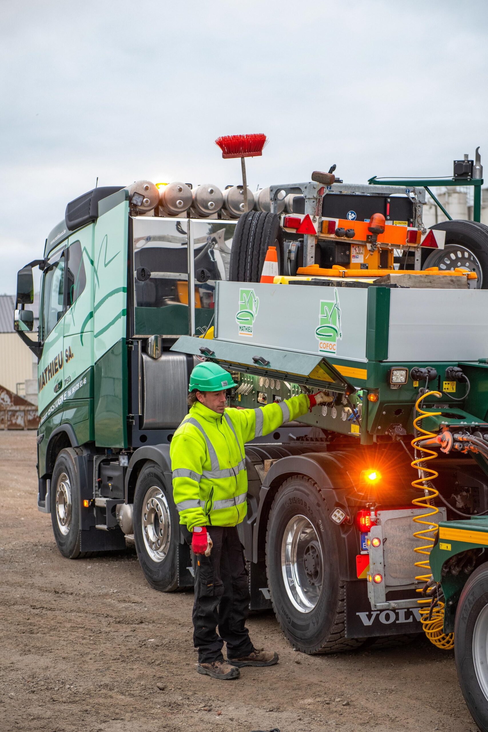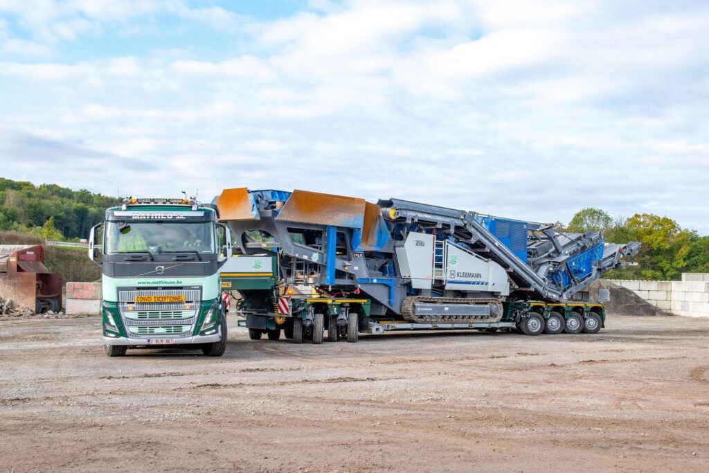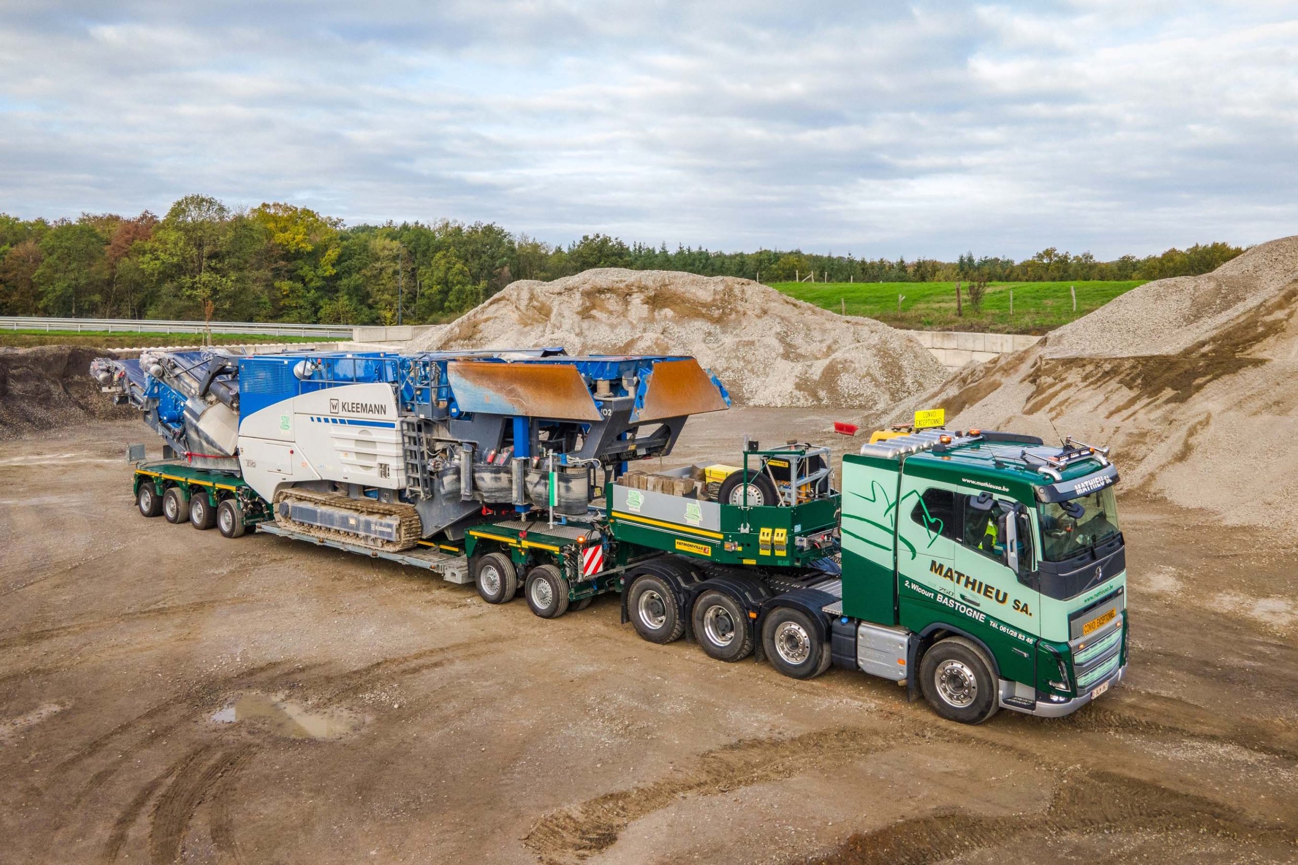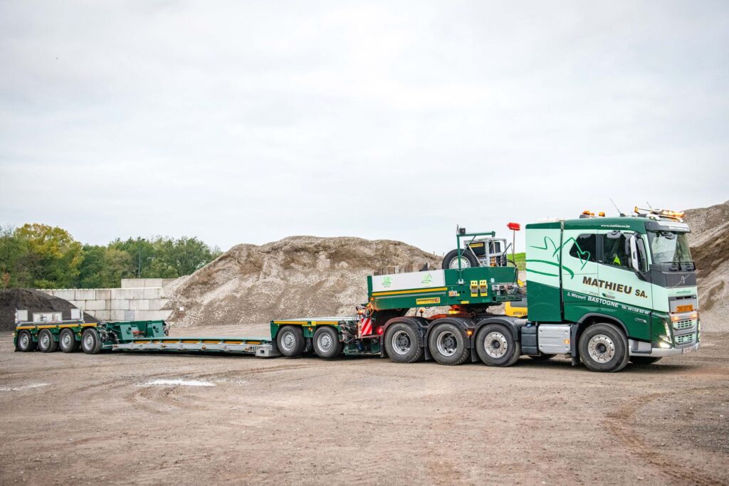 De dag breekt net aan wanneer een groene combinatie van de Belgische onderneming Mathieu het terrein van de firma Famenne-Bétons in Marche-en-Famenne (50 km onder Luik) oprijdt. Fabrice, een ervaren chauffeur in het zwaartransport, stuurt de 2+4 VarioMAX Plus-dieplader naar de geparkeerde breekmachine, die op haar volgende inzet wacht.