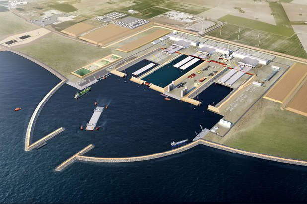 - Visualisatie van de werkhaven en tunnelfabriek in Rødbyhavn.