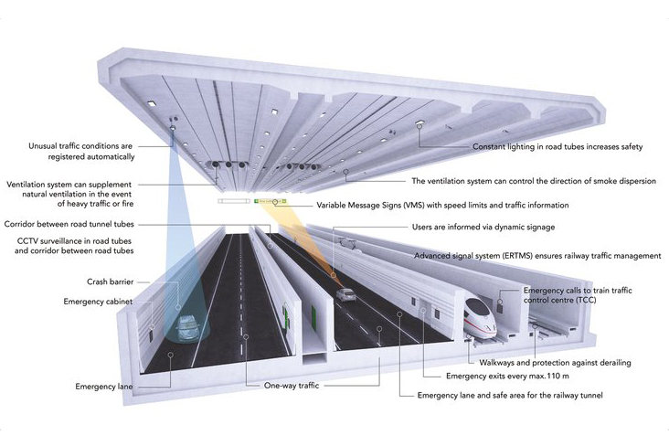 - Illustratie van de veiligheidsmaatregelen in de Fehmarnbelt-tunnel.
