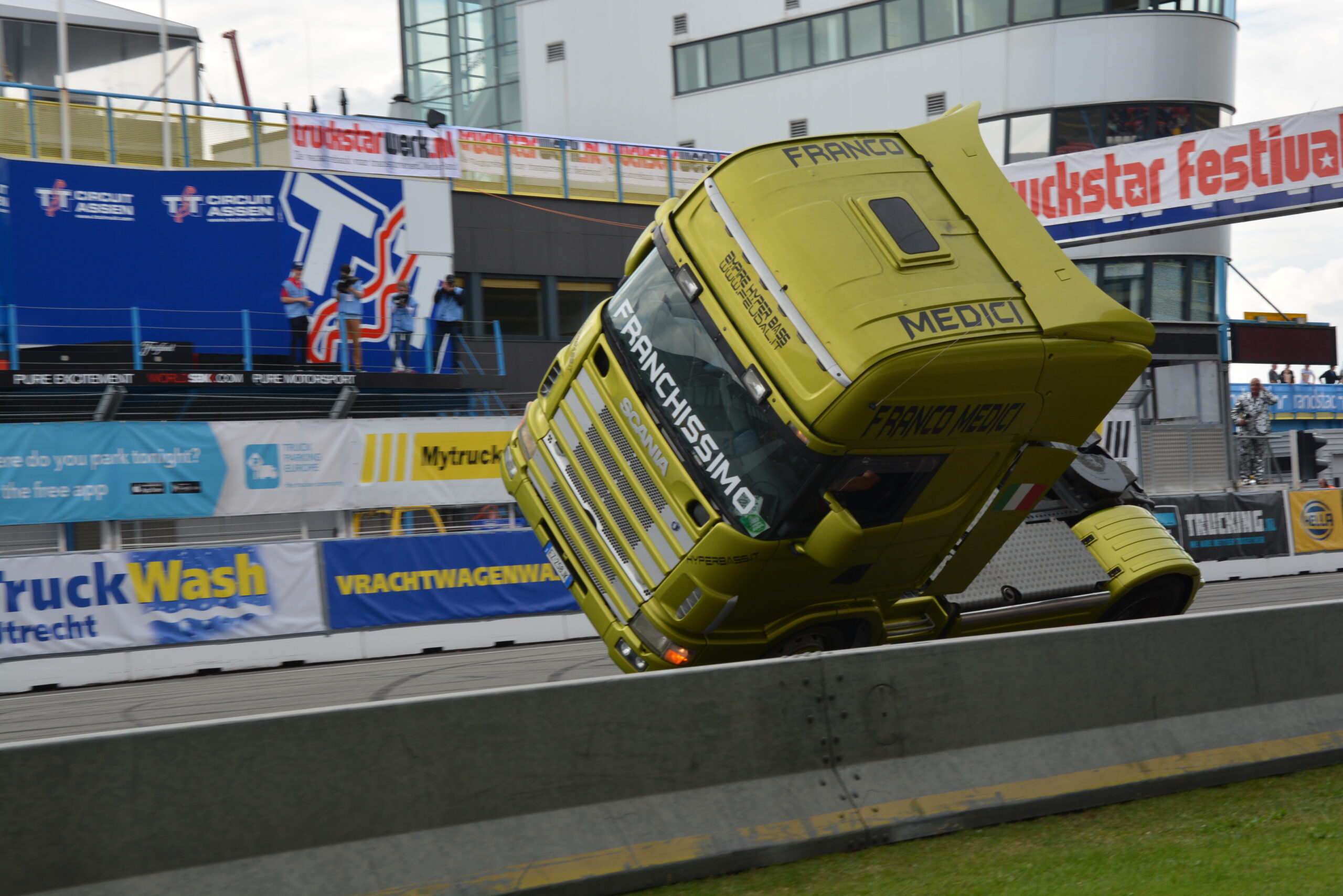 De Italiaan Franco Medici heeft van het opzoeken van gevaar zijn beroep gemaakt. Samen met zijn zeven-koppige stuntteam laat hij indrukwekkende stunts zien waarbij de voetjes, of beter gezegd de banden van de meegebrachte voertuigen de lucht in gaan. Het Medici-team rijdt met drie geprepareerde BMW personenauto’s, en daarnaast met een Scania 164.580 V8 trekker. Om die laatste is het ons natuurlijk te doen. Met de trekker haalt Franco halsbrekende toeren uit die je beter niet kunt proberen met je eigen vrachtwagen.