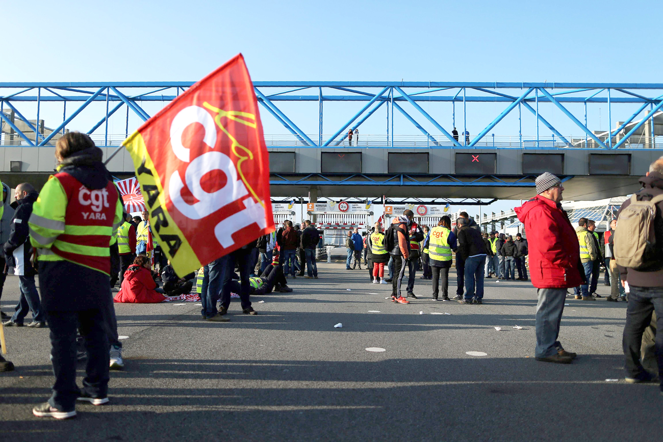 Foto: De Franse vakbond CGT blokkeert vandaag tolpoorten naar de Pont de Normandie bij Le Havre. (ANP)