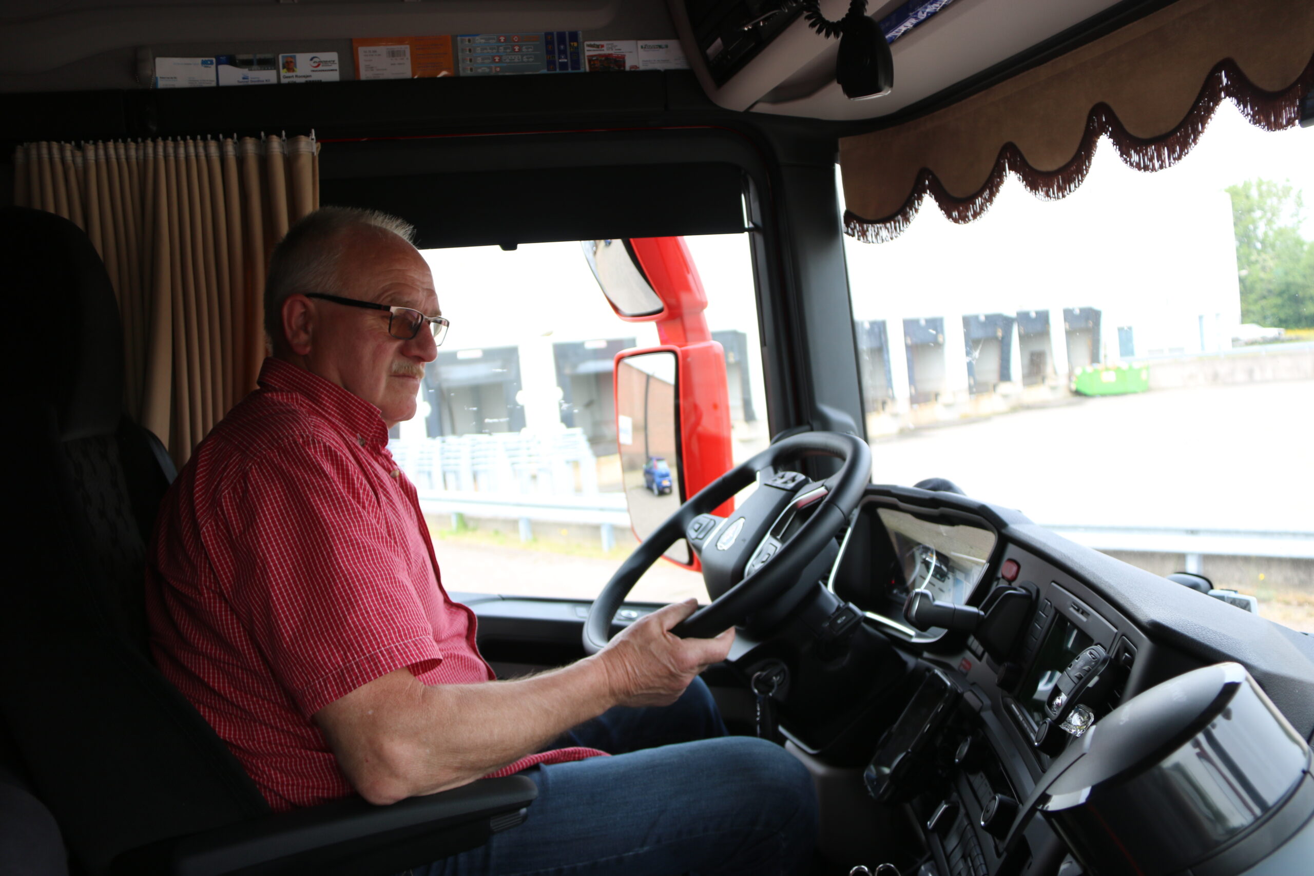 Geert Roosjen stuurt in de richting van het Friese Stroobos en laat de Scania op een afrit uitrollen. Af en toe moet de retarder aan de bak. ,,Wat een uitvinding’’, zegt hij. ,,Ik gebruik de rem nauwelijks nog.’’ Het lage verbruik van dit type Scania spreekt hem ook aan. ,,Hij rijdt 1 op 3,6, mijn vorige Volvo verbrandde 1 op 2,9. De Scania schakelt op bij 1.400 toeren, bij de Volvo kon ik gewoon doortrappen.’’
