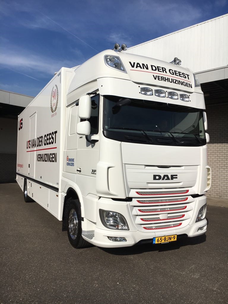 De DAF XF Euro 6 is behalve zuinig ook zeer ruim. De truck heeft een laadruimte van 54 m³. ,,Hierdoor kan er meer vervoerd worden in één vrachtwagen, waardoor het aantal transportbewegingen verder omlaag kan. Dat is niet alleen handig voor verhuizingen binnen Nederland, maar zeker ook voor verhuizingen naar het buitenland. Op de lange ritten wordt de meeste milieuwinst behaald”, meent Van der Geest, die stelt dat de chauffeur centraal staat in de grote DAF. ,,De cabine is zeer ruim en comfortabel en een Driver Performance Assistent helpt de chauffeur om de meest kostenefficiënte rijstijl te bereiken.’’