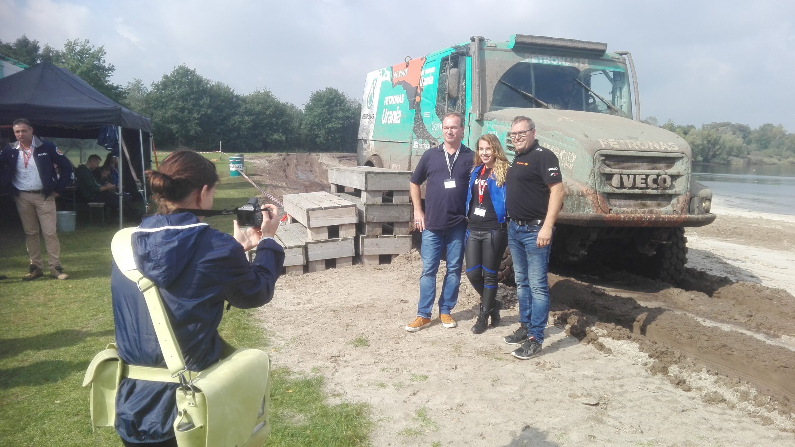 Klanten van de Italiaanse truckfabrikant kregen de gelegenheid op een speciaal voor de gelegenheid uitgezet parkoers te ervaren hoe heftig het er in een cockpit van een Dakar-truck aan toe gaat. Erg heftig dus. Door de zware regenval van de afgelopen dagen was het terrein erg zwaar en blubberig, waardoor zelfs de ervaren De Rooy eenmaal vast kwam te zitten.