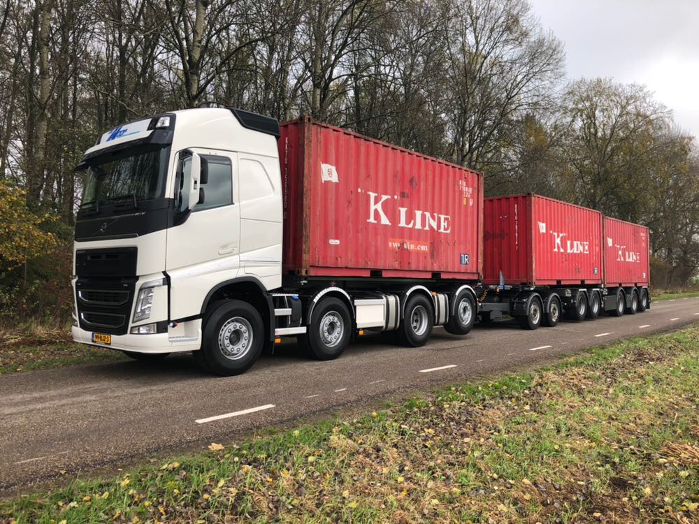 Deze Volvo is tevens als LZV trekkende eenheid geregistreerd. ,,Dat is in ons werk, het vervoeren van zeecontainers, erg belangrijk. Ons specialisme is eigenlijk om het gewicht van veelal ongelijkmatig beladen containers toch correct te vervoeren, zonder overschrijding van wettelijk toegestane aslasten. Daar zijn al onze voertuigen op ingericht. Ook deze Volvo kan dus optimaal als 3-TEU combinatie worden ingezet.’’