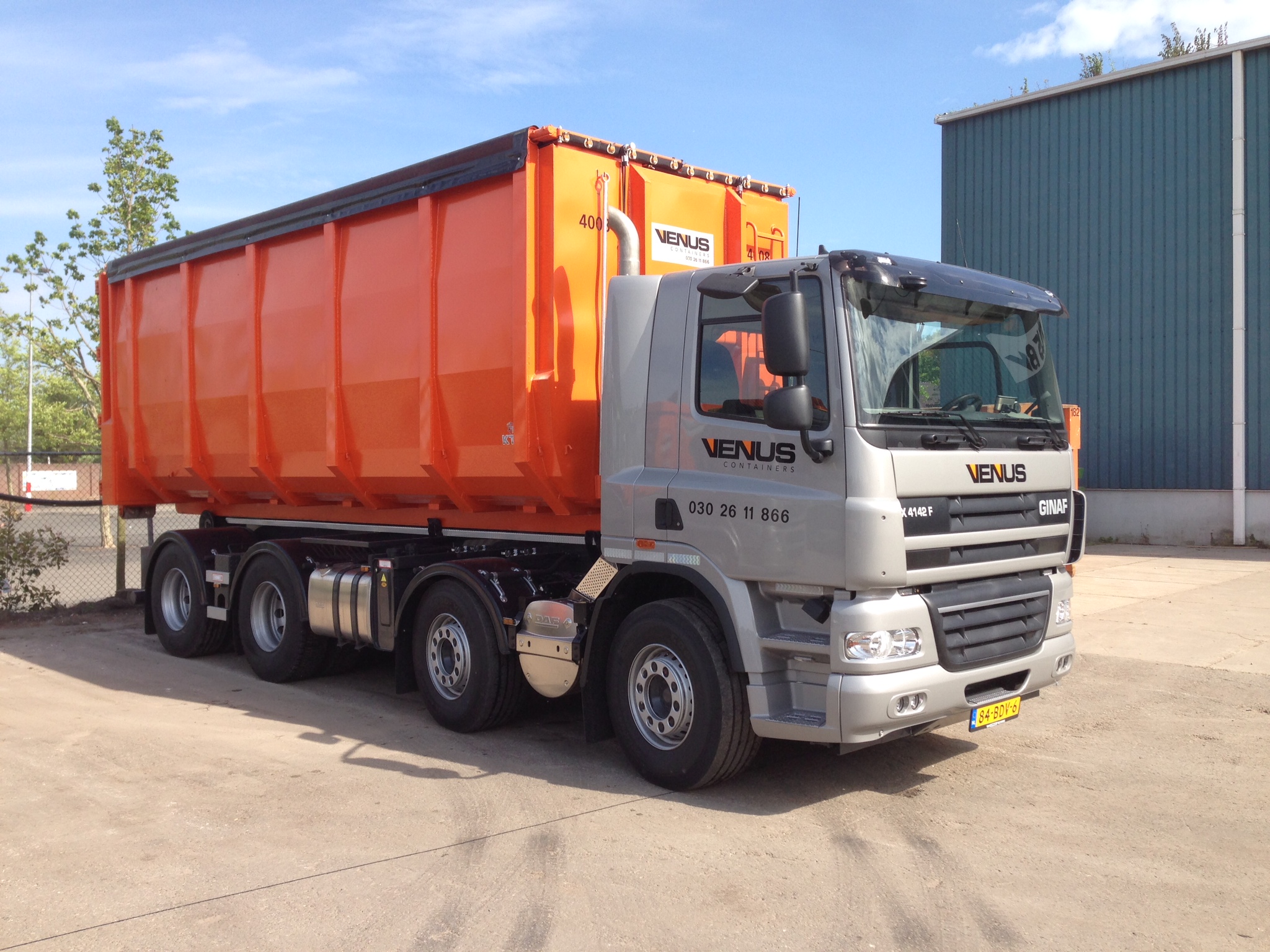 Ginaf dealer Van Ginkel Techniek uit Utrecht leverde onlangs een nieuwe X4142-F aan Venus Containers. Het voertuig heeft een GVW van liefst 41,5 ton. Dat is een gunstige waarde voor een 8×2 voertuig. Dit is bereikt door het standaard voertuig te voorzien door een Ginaf fusee-gestuurde, luchtgeveerde en hefbare achteras. Deze staat op 1,80 meter van de derde as. Deze as heeft daardoor een wettelijke aslast van 10 ton, terwijl de technische aslast zelfs 12 ton bedraagt.