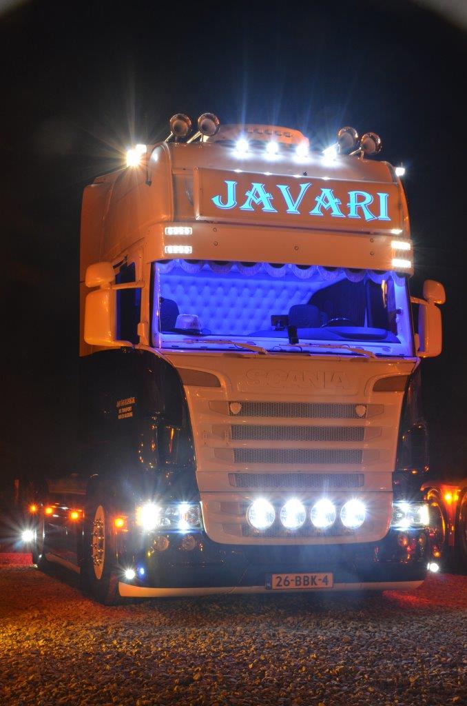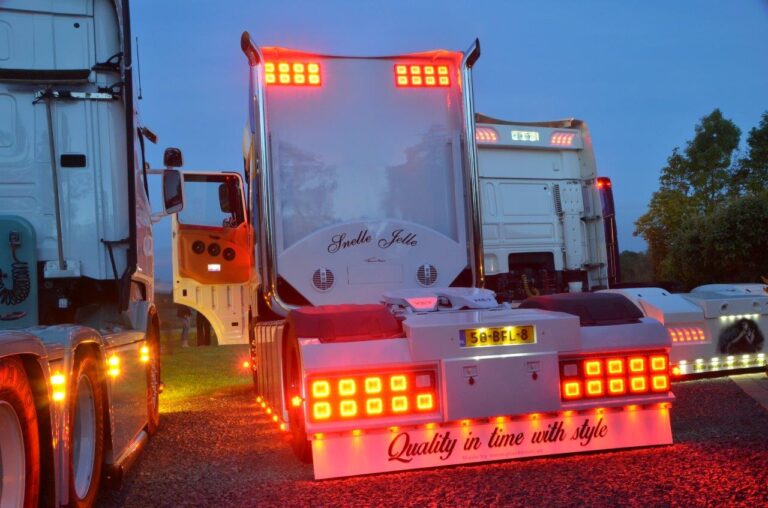 Als de zon ondergegaan is, ontstaat er een heel nieuw beeld. Dit is de achterkant van de DAF XF van Jelle Schouwstra, en die achterkant is goed voor elkaar, zullen we maar zeggen.