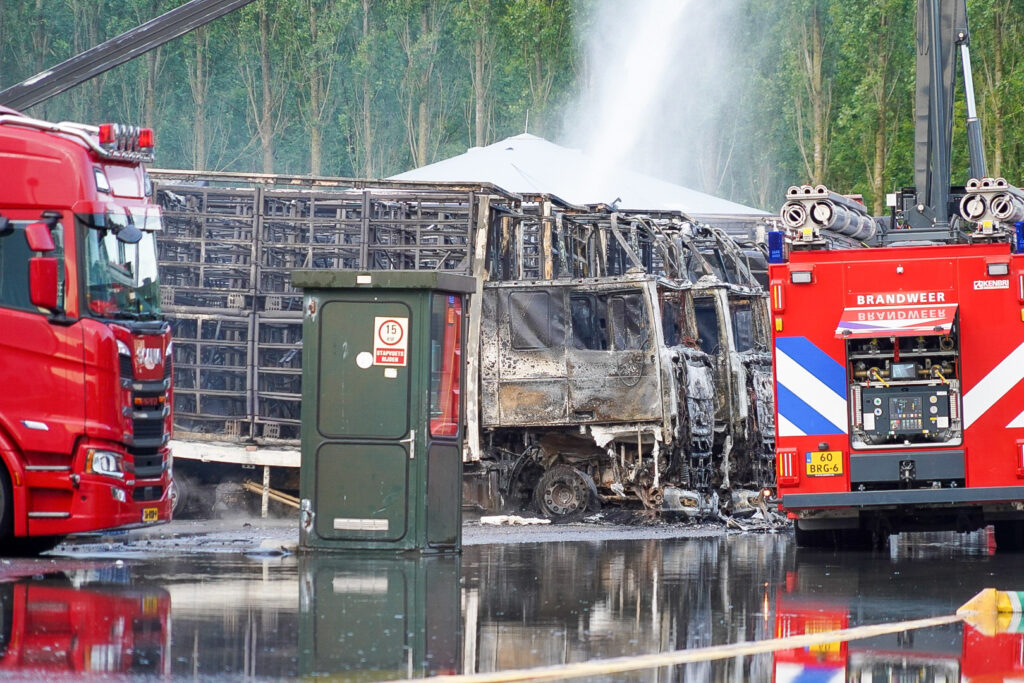 Afgelopen zondagochtend zijn bij de kippenslachterij Plukon in Oosterblokker meerdere vrachtwagens in vlammen opgegaan. Er zijn gelukkig geen gewonden gevallen, maar de schade wordt geschat op enkele miljoenen euro’s. De zwarte rookwolken waren van grote afstand zichtbaar en meerdere woningen in de omgeving werden uit voorzorg ontruimd. Door de intense hitte klapten de banden één voor één, waarbij elke knal direct de aandacht trok. Om 6:32 uur werd het NL-Alert ingetrokken en gaf de brandweer het sein ‘brand meester’. Zodra de rook was opgetrokken, werd de impact goed zichtbaar: het vuur had niets overgelaten van de vrachtwagens.