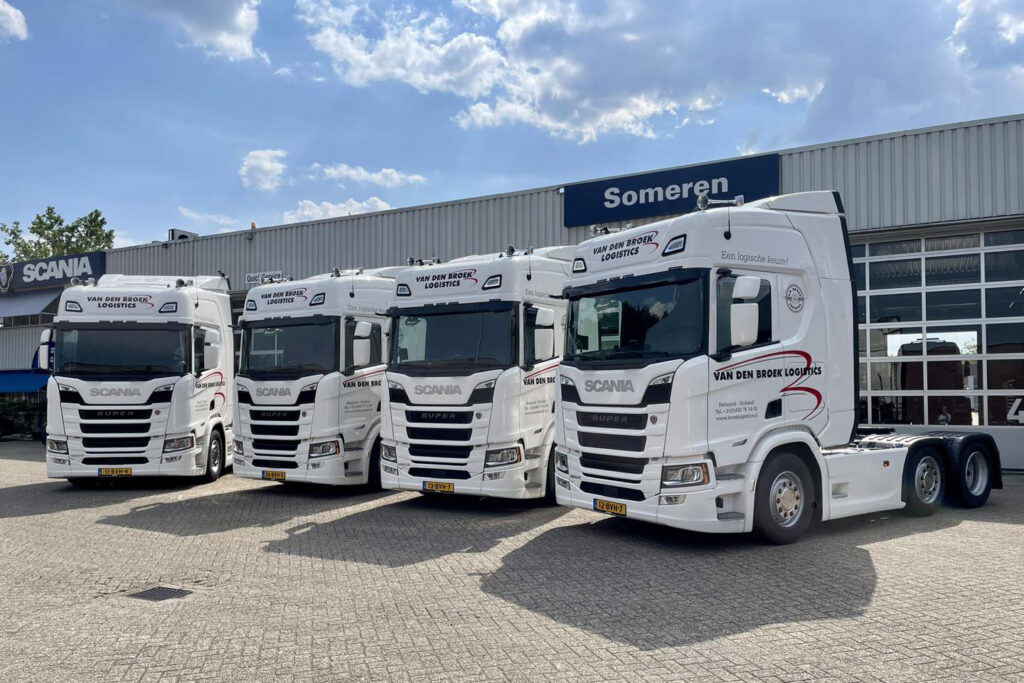 Van den Broek Logistics uit Helmond heeft vier Scania 460R trekkers in gebruik genomen. De trucks uit de R-serie zijn onderdeel van een totaalorder van vijfentwintig stuks. De logistieke dienstverlener liet de keuze op Scania vallen vanwege de multifunctionele inzetbaarheid van de 6×2 trekkers, die dankzij het lage chassis met de luchtvering over twee rijhoogtes beschikken.