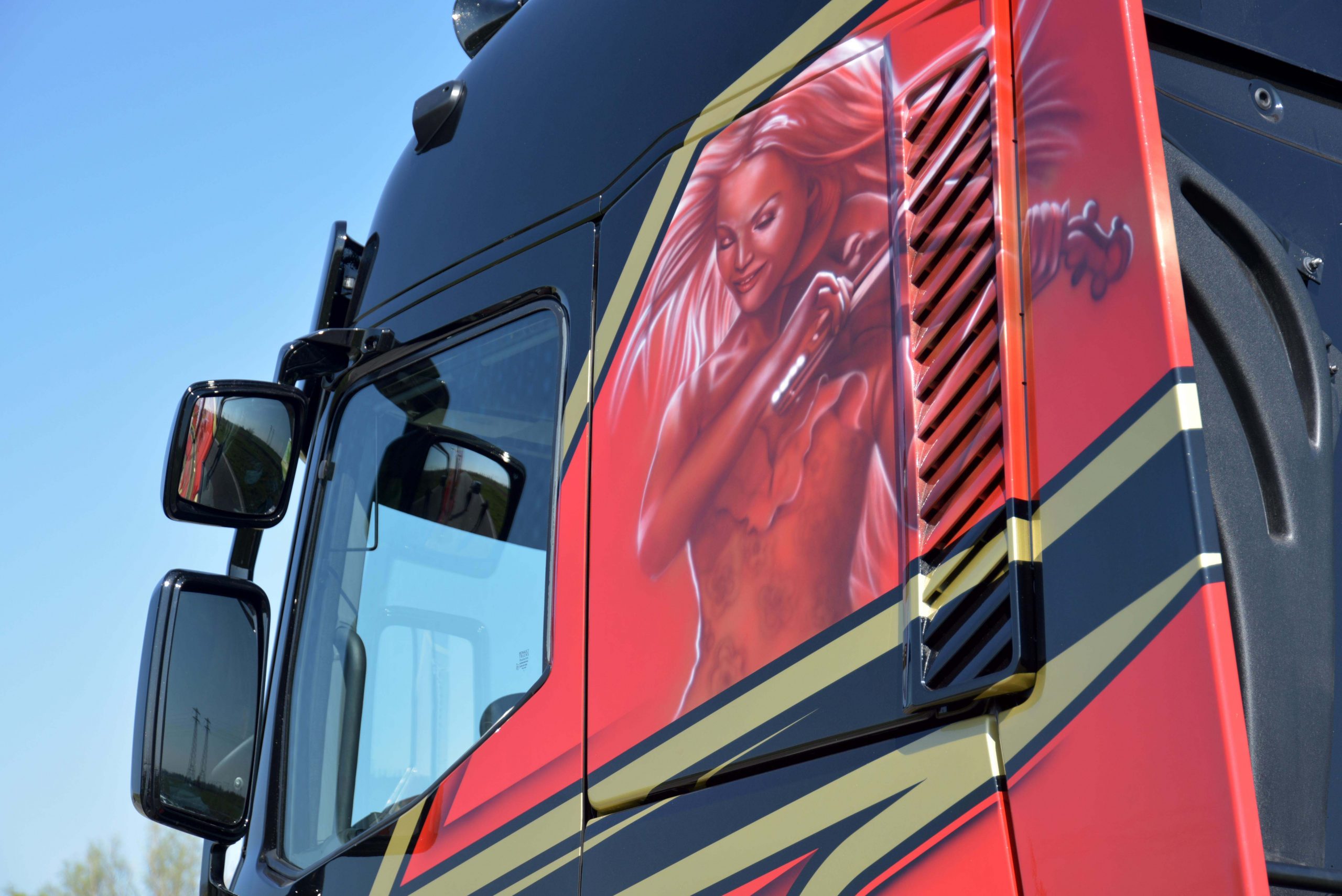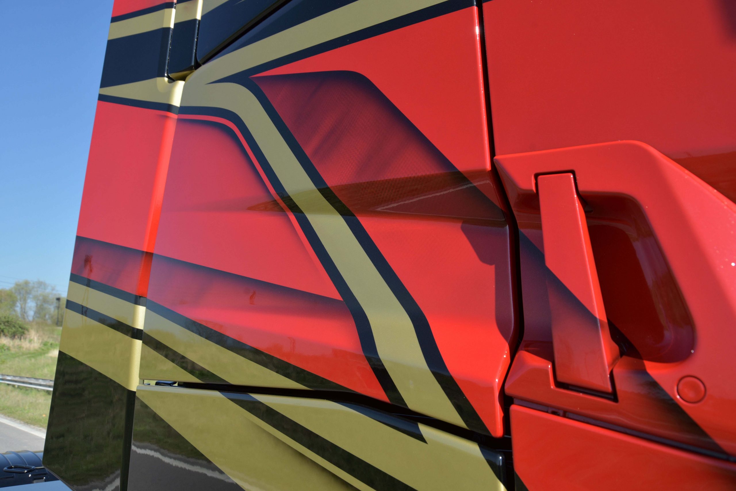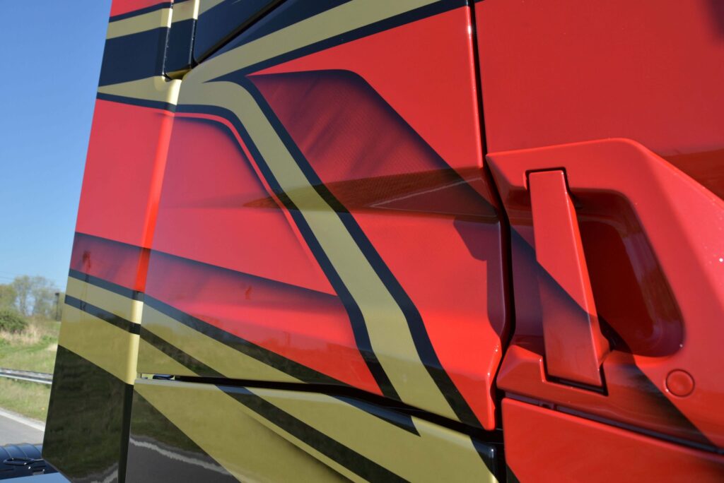 De zwarte kleur en rood met gouden striping geven de truck een stoer uiterlijk. Het Noord Nederlands orkest zorgde voor de inspiratie voor de special paint op de zijkanten. “MW Designs heeft er echt iets speciaals van gemaakt,” zegt Brolsma trots. “Eigenlijk moet je hem een keer of tien zien voordat je de ontelbare details hebt ontdekt.”