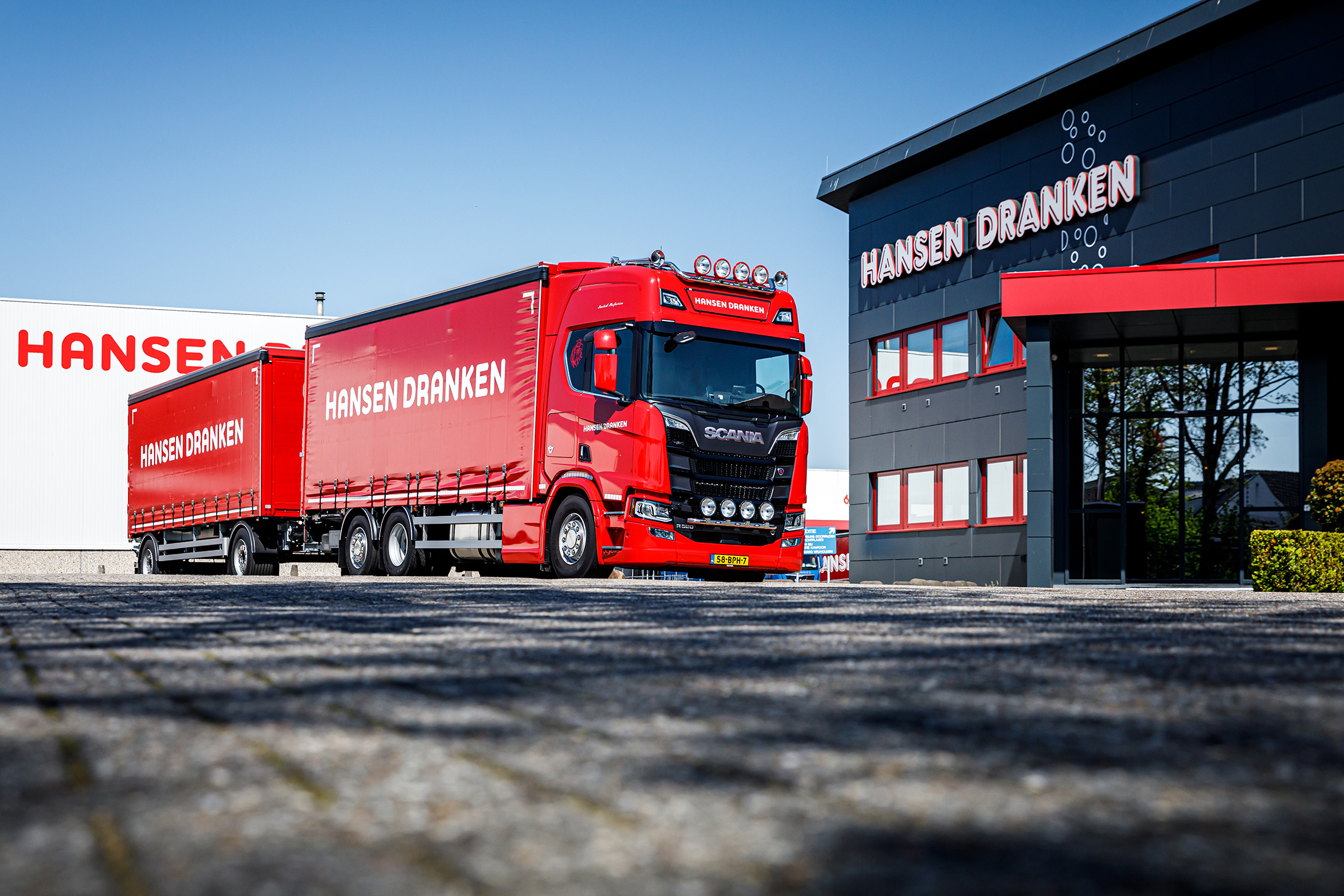 “Het moest een visitekaartje worden én we wilden onze chauffeur John Theulen in het zonnetje zetten. Want die werkt al ruim 30 jaar voor ons”, vertelt Guus Hansen van de gelijknamige drankenhandel in Linne (Limburg) over de aanschaf van de nieuwe R520 6×2 bakwagen met gestuurde naloopas.